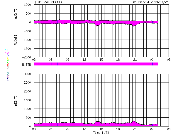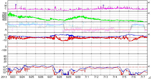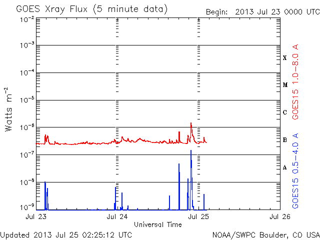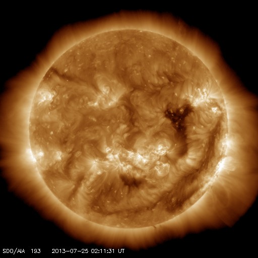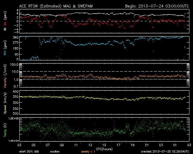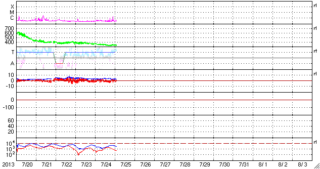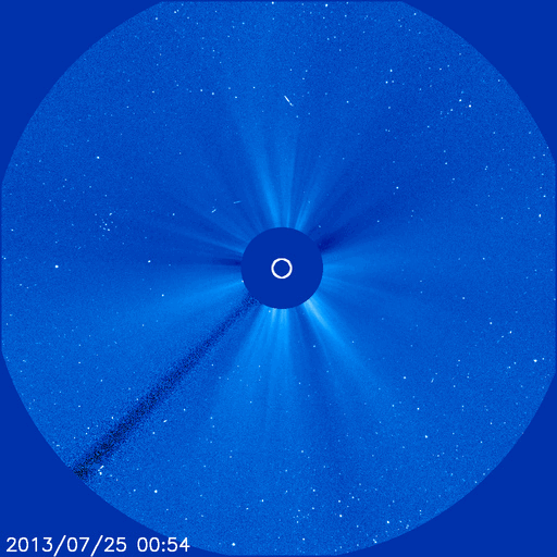 2013/ 7/25 11:30 更新 太陽風は低速で安定し、磁気圏も静穏です。SOHO衛星のカメラに「かに座」が写っています。 担当 篠原 CMEの観測に活躍しているSOHO衛星のLASCO C3カメラに、 かに座が姿を現しています。 説明付きの動画を掲載します。 今日の写真では、 太陽の左側に、かに座の甲羅のあたりの四角形が写っています。 その中心には、プレセペ星団という星の集まりも見えています。 かに座は、冬から春にかけて夜空に見える星座です。 夏を迎えて、夜とちょうど反対の太陽の方向にやって来たのです。 これからしばらく、LASCO C3の写真を右に進んで行く様子を楽しめます。 現在の太陽は、1800黒点群で C1.0、C1.8と小規模のフレアが発生した程度で、 活動は穏やかです。 太陽風の速度は、350km/秒から340km/秒へ、 小幅ですが一段と低下しています。 磁場強度も3〜4nTとやや弱まった状態が続いています。 SDO衛星AIA193では、 昨日紹介したコロナホールはさらに西に進んでいます。 ここからの影響が明日くらいに始まるでしょうか。 磁気圏も静穏です。 AE指数は目立った変化は発生していません。 LASCO C3カメラに写ったかに座の紹介は以前にも行いましたが、 いつだったか調べてみると、ちょうど2年前の同じ日、2011年7月25日でした。 考えることって毎年同じなんですね。
