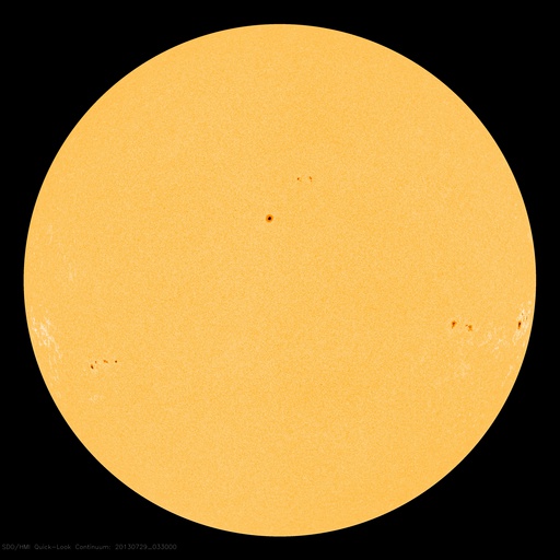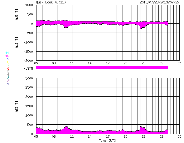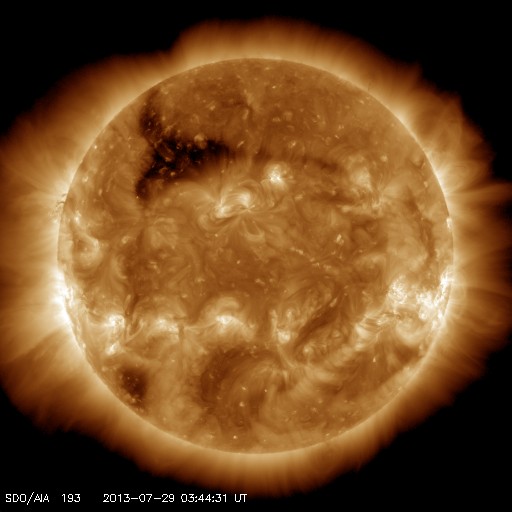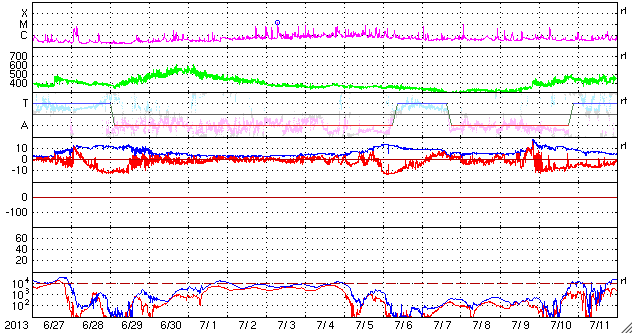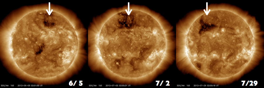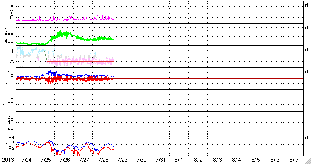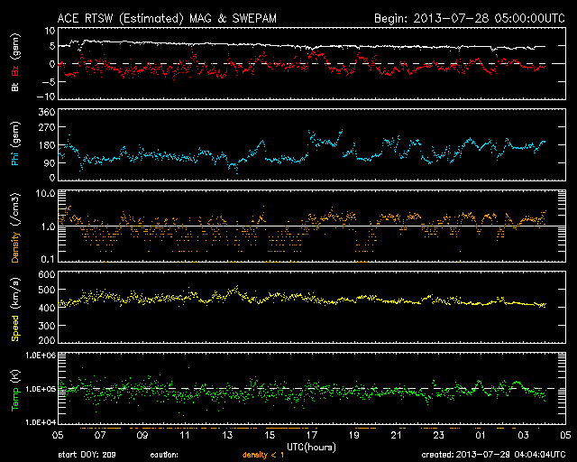 2013/ 7/29 13:06 更新 太陽風は40km/秒台と穏やかです。Cクラスのフレアが増えています。 担当 篠原 太陽風は、400km/秒台前半と平均的な速さが続いています。 磁場強度も5nTで安定していて、こちらも平均的な値です。 磁場の南北成分は、小さい振幅で多少南寄りになっています。 この影響か、AE指数は200〜300nTくらいの小さい変化が 時々発生しています。 太陽風は、このまま穏やかな状態が続きそうですが、 SDO衛星AIA193の太陽コロナ写真を見ると、 北半球の高緯度側に三角形に見えるコロナホールが現われています。 太陽の自転周期(27日)で1回分の7月2日と、 2回分の6月5日のコロナホールの様子と比べてみて下さい(1枚目の写真)。 すると、形が変化しているとともに、位置も次第に左側に動いています。 前周期、前々周期の太陽風には、 このコロナホールの影響は特にありませんでしたが、 こうして変化していくうちに、 影響が地球に到来するようになるかもしれません。 今回は、影響がやって来るなら5日後くらいでしょう。 太陽は、C1〜3と規模は小さいですが、 Cクラスのフレアが7回発生してます。 太陽の右端に近づいている1800黒点群と、1805黒点群です。 黒点の見え方には特に変化はありませんが、 活動度が少し上がっている様です。 ![]() SDO衛星のAIA193カメラによる、コロナホールの長期変化。 (c) SDO (NASA)、作図:宇宙天気ニュース ![]() SDO衛星のAIA193カメラによる太陽コロナの様子 (c) SDO (NASA) ![]() SDO衛星による太陽の可視光写真。マウスの矢印を写真に重ねると、黒点番号付きの写真に切り替わります。 (c) SDO (NASA) ![]() ACEが観測した太陽風の磁場(1番上の枠、白線は全体の強度、赤線は南北成分) および、太陽風の密度(3番目の橙線)、速度(4番目の黄線) (c) NOAA/SWPC ![]() リアルタイムAE指数 下段のAEグラフの値が高くなると、オーロラ活動が活発化しています。 (c) 京都大学, NICT ![]() 27日の太陽周期に合わせたデータプロット 太陽が同じ面を地球に向けていた27日前の変化から、今後を予想することができます。 (c) 作図:宇宙天気ニュース