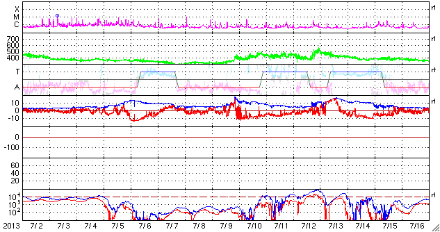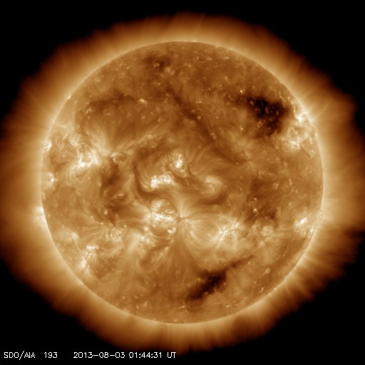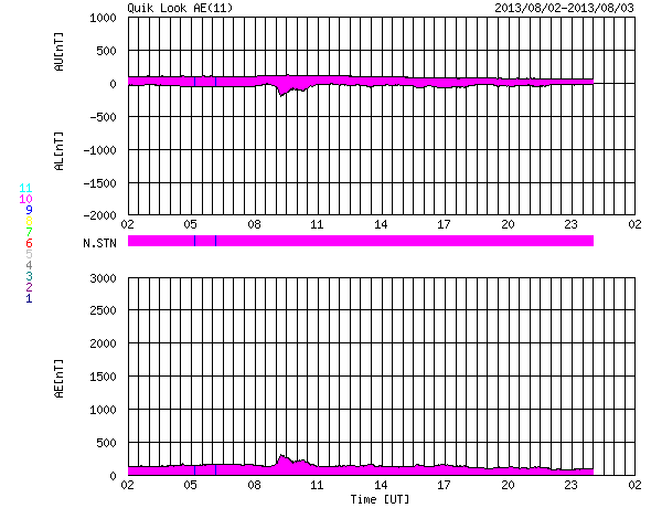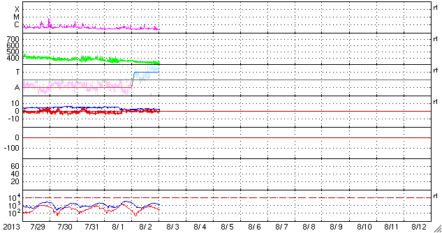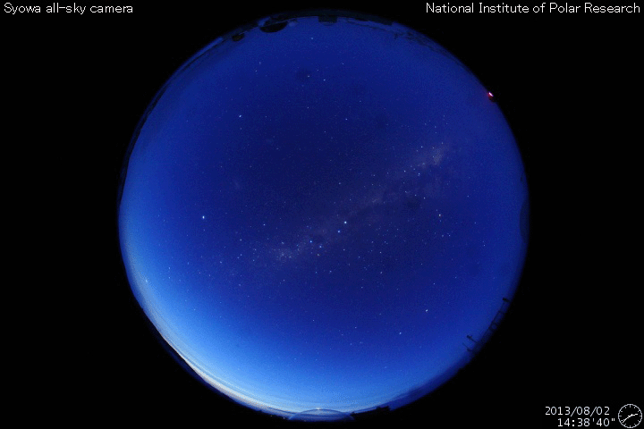 2013/ 8/ 3 10:52 更新 太陽風速度は300km/秒に下がり、磁気圏も静かです。 担当 篠原 宇宙天気現象とは関係ありませんが、 南極の昭和基地の全天カメラで、 夕暮れと天の川がきれいに見えていたので、動画にしました。 夕暮れと言っても、既に天の川が写っているので、 実際にはかなり暗くなっているのでしょう。 薄明るい空がだんだん暗くなっていくようすはとてもきれいです。 写真の中央付近には、ひっくり返った南十字星も見えています。 さて、現在の宇宙天気はとても穏やかです。 太陽風は、速度が350km/秒から300km/秒へ下がり、 一段と低速の風になっています。 磁場強度も3nTとやや弱い値で安定しています。 今のところ、コロナホールの影響がやって来る気配は見られません。 もうしばらく待ってみる必要がありますが、 このまま静かな太陽風が続くのかもしれません。 AE指数もほとんど変化がなく、磁気圏も静かです。 太陽も、Bクラスの小さいフレアが起きている程度で、 活動は穏やかです。 南西に新しく1812黒点群が現われるなど、 黒点群は多いのですが、目立った動きはありません。 ![]() 南極の昭和基地の夕暮れと南天の天の川。 (c) 国立極地研究所、(動画加工 : 宇宙天気ニュース) ![]() SDO衛星のAIA193カメラによる太陽コロナの様子 (c) SDO (NASA) ![]() SDO衛星による太陽の可視光写真。マウスの矢印を写真に重ねると、黒点番号付きの写真に切り替わります。 (c) SDO (NASA) ![]() ACEが観測した太陽風の磁場(1番上の枠、白線は全体の強度、赤線は南北成分) および、太陽風の密度(3番目の橙線)、速度(4番目の黄線) (c) NOAA/SWPC ![]() リアルタイムAE指数 下段のAEグラフの値が高くなると、オーロラ活動が活発化しています。 (c) 京都大学, NICT ![]() 27日の太陽周期に合わせたデータプロット 太陽が同じ面を地球に向けていた27日前の変化から、今後を予想することができます。 (c) 作図:宇宙天気ニュース