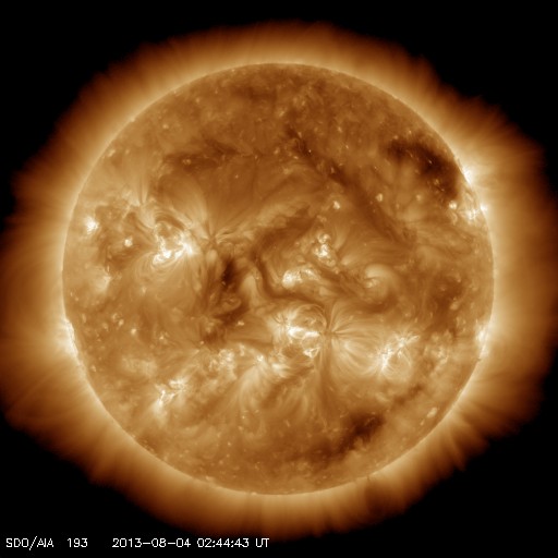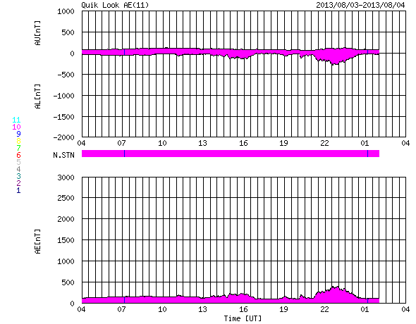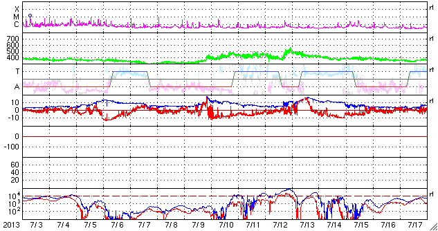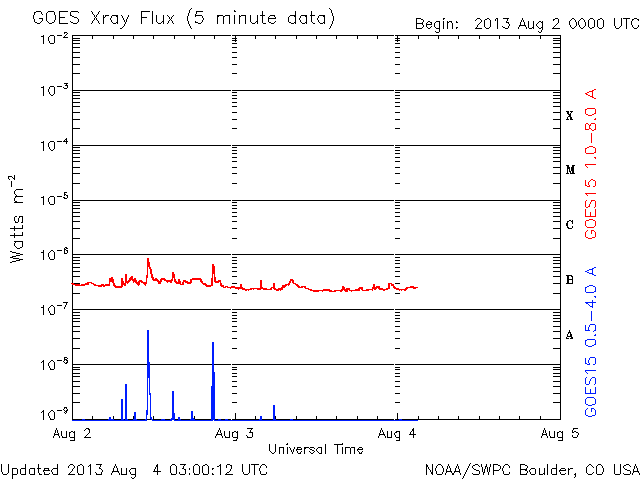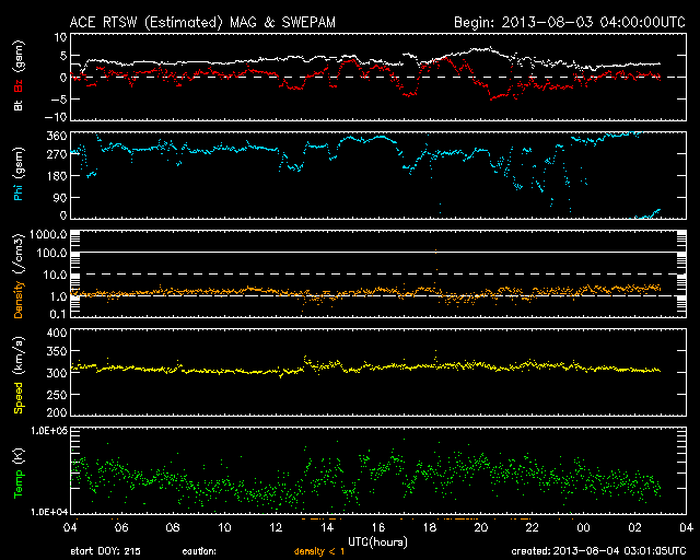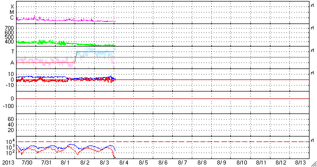 2013/ 8/ 4 12:01 更新 300km/秒の低速の太陽風が続いています。太陽も穏やかです。 担当 篠原 太陽風の速度は、300km/秒に下がったまま、 低速の状態で安定しています。 磁場強度も、一時的に6nTに上がる変化も見られましたが、 基本的には3〜4nTとやや弱い情態が続いています。 コロナホールの影響は見られないまま、 27日周期の図の前周期(7月7日頃)と同様の 穏やかな太陽風が続いています。 磁気圏の活動も静かです。 AE指数のグラフは、一時的な磁場強度の強まりに関連した、 300nTの弱い高まりが見られるだけで、 他の時間帯はほとんど変化していません。 太陽の活動も穏やかです。 X線グラフは、Bクラスの範囲でもほとんど活動がありません。 黒点も、少しずつ少なくなり、 寂しい太陽面になりつつあります。 今朝5時に、種子島よりH-2Bロケットが打ち上げられました。 学校の屋上からロケットを眺めようとしたのですが、 残念なことに雲におおわれて、何も見えませんでした。 そして、朝になるとともに久しぶりの雷雨になっています。 よりによってこの日に降らなくてもと思うのですが。