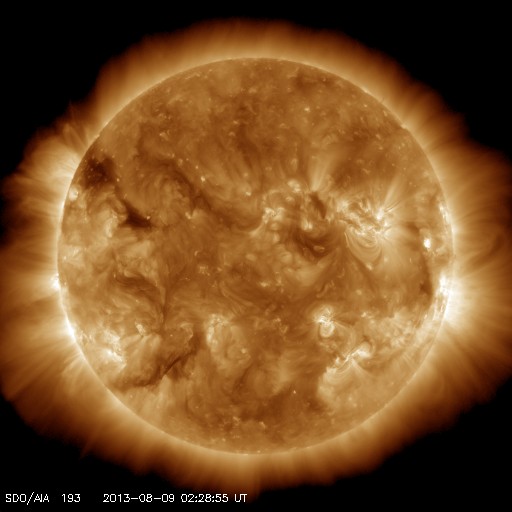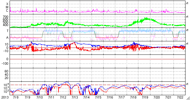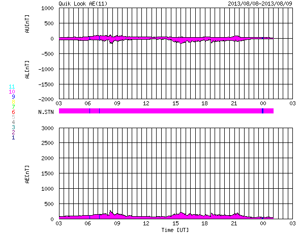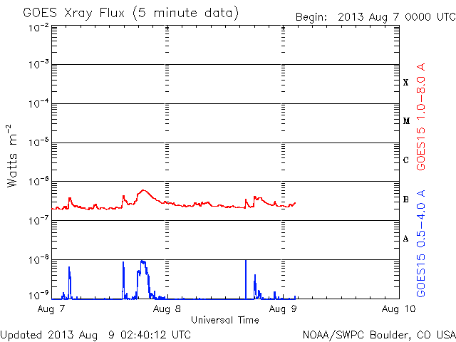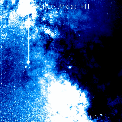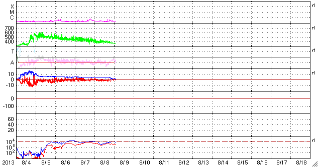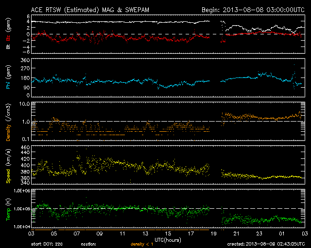 2013/ 8/ 9 11:43 更新 太陽風は低速風に変わっています。太陽の活動も穏やかです。 担当 篠原 宇宙天気の話題ではありませんが、 ATEREO Ahead衛星のHI1カメラで、 地球に水星が接近し、離れていく様子を見ることができました。 7月19日から約20日間の動きを動画でご覧下さい。 動画の最初に通り過ぎていく雲の様なものは天の川です。 写真のやや左で静止しているのが地球です。 そこに右下から水星が近づき、 曲がりながら地球をかすめて通り過ぎています。 もちろん、本当に水星が地球に近づいているわけではなく、 衛星から見てふたつが重なって見えただけです。 その様子を2枚目の図で見ることができます。 右上の赤丸が撮影したSTEREO Ahead衛星です。 ここから水星(Mercury)と地球(Earth)は左下に一直線に並んでいます。 現在の宇宙天気ですが、 太陽風の速度は、昨日は400km/秒程度ありましたが、 今日に入った頃から低下を始め、 現在は360km/秒と低速の風になっています。 磁場強度も、昨日は4nTでしたが今朝になって一段下がり、 2nTとだいぶ弱くなっています。 27日周期の図を参考にすると、 太陽風磁場のセクターの切り替わりが来ているのかもしれません。 もうしばらく様子を見る必要があります。 磁気圏は静穏です。 AE指数はほとんど変化がありません。 太陽風が弱まってきて、今後も静かな状態が続きそうです。 SDO衛星AIA193では、コロナホールは特に見られません。 太陽風、磁気圏の穏やかな状態はしばらく続きそうです。 太陽の活動も静かです。 X線のグラフは、Bクラスの小さな変化が起きている程度です。 黒点も群数は多いのですが、どれも小さい黒点ばかりです。 放射線帯の高エネルギー電子は、現在も高い状態が続いています。 こちらの減衰はゆっくりと進みます。