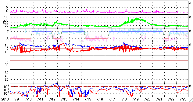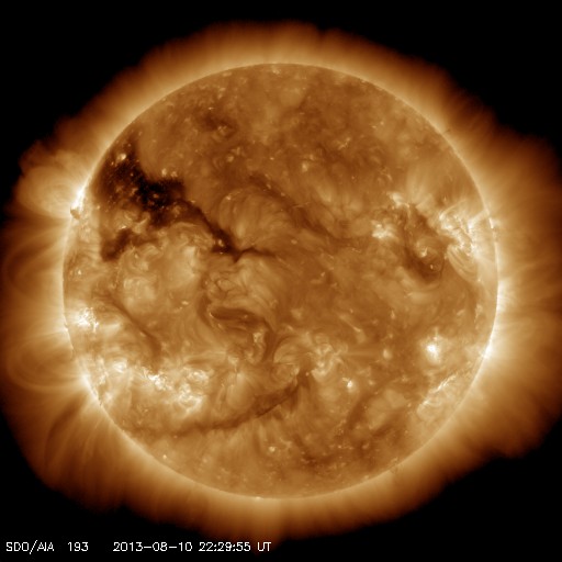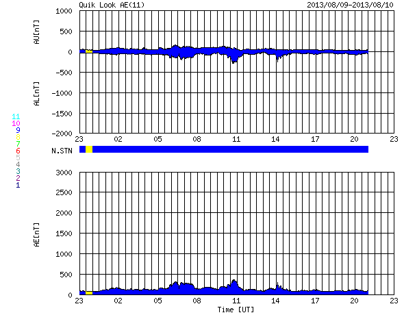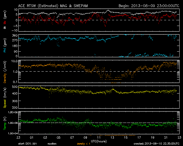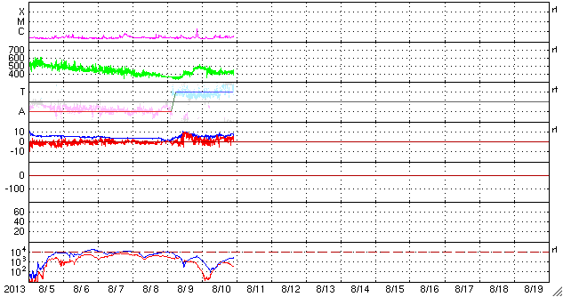 2013/ 8/11 07:32 更新 太陽風は400km/秒近くに下がっています。太陽は穏やかです。 担当 篠原 太陽風の速度は、480km/秒から420km/秒に下がり、 平均的な速度に戻っています。 速度の高まりは、半日ほどで終わっています。 磁場強度は、6〜7nTとやや強めの状態で安定しています。 南北成分は比較的北寄りです。 このため、磁気圏は概ね静穏で、 AE指数のグラフは、小規模の変化が時々起きている程度です。 SDO衛星AIA193の太陽コロナ写真では、 太陽の北東(左上)に広いコロナホールが見えています。 その先頭(右端)は、太陽の中心に近づいていますが、 影響がやってくるのはもうしばらく先です。 一方、8日に発生したCMEの影響がそろそろ到来するかもしれません。 速度の変化は小さいと思いますが、磁場の強まりがやって来て、 磁気圏の活動を強める可能性があります。 それが見られなければ、太陽風はこのまま穏やかでしょう。 太陽は、東の端から新しい黒点が次々と現れています。 今日は記事の更新時刻が早いので、 群番号の最新情報はまだ分かりません。 X線グラフは、Bクラスの小さい変化が起きている程度です。 今日は鹿児島市の科学館で、 子ども向けに鹿児島高専を紹介する展示会を行います。 これから展示機材を抱えて出発するところです。 その直前に急いで更新しています。