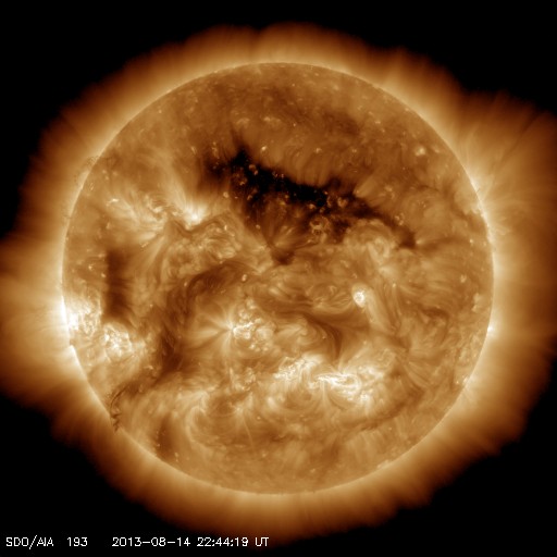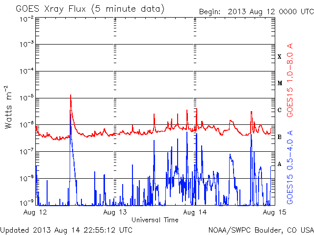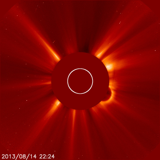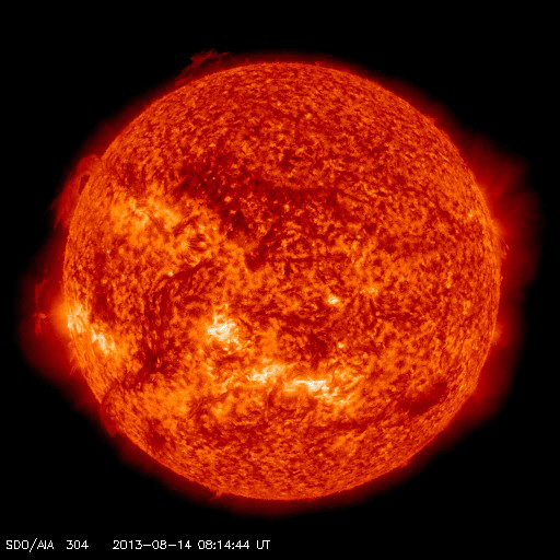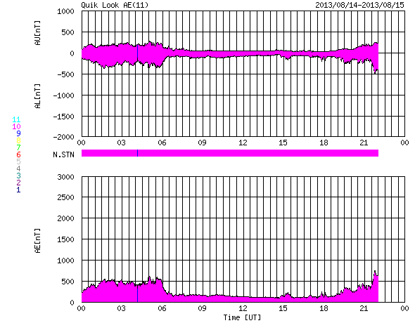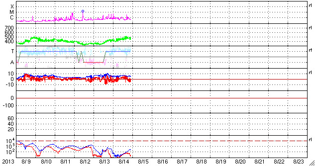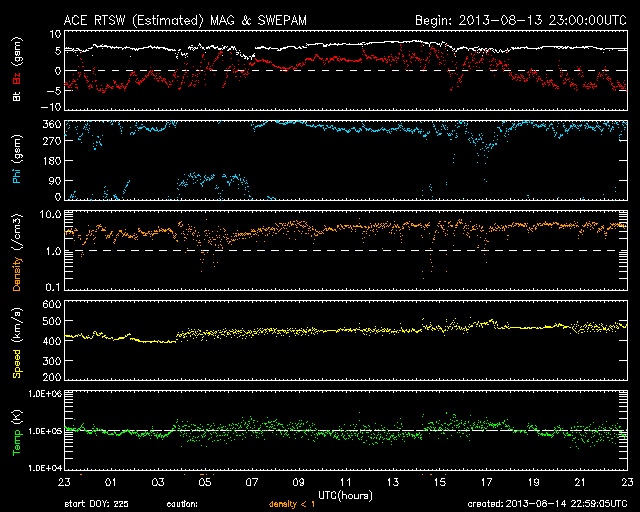 2013/ 8/15 07:59 更新 太陽でフィラメントの噴出が発生しました。太陽風はやや高速になっています。 担当 篠原 太陽の南半球にずっと見えていたダークフィラメントが 昨夜から今朝にかけて噴出を起こしました。 SDO衛星AIA304による動画を見てください。 太陽の南西(右下)で黒いかたまりの様に浮かんでいた ダークフィラメントが、 ゆっくりと上昇し、外へ向かって噴き出しています。 拡大写真では、ガスの細かい動きも良く見えて、 なかなかの迫力です。 この噴出によって、CMEが発生しています。 SOHO衛星LASCO C2の最新写真の右下に、 ちらっと顔を出しています。 まだ発生直後なので、詳しくは明日お知らせします。 太陽では、1818と1817黒点群が目立っています。 昨日と同じサイズで拡大写真を掲載します。 形の変化など見比べてください。 この1817黒点群で、C1.5、C3.6、C1.5と 小規模フレアが発生しています。 太陽風は、速度がゆっくりと上がって、 480km/秒とやや高速の風になっています。 磁場強度は5nTと平均的な状態で安定しています。 コロナホールの影響が及び始めているのかもしれません。 しかし、磁場強度があまり高まっていないので、 本格的な影響はこれから更にやって来るのではないかと思います。 この後も太陽風の変化に注目してください。 磁気圏は、太陽風磁場の南向きに反応して、 AE指数で500nT程度の変化が、 グラフの前半と最後に起きています。 今後磁場強度が強まる変化が到来すると、 より規模の大きいオーロラ活動が発生するかもしれません。