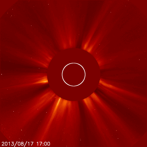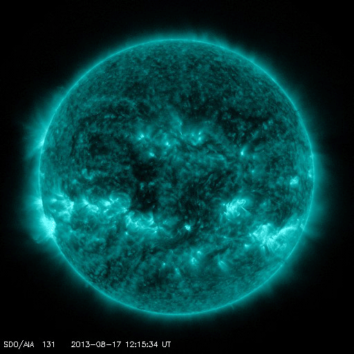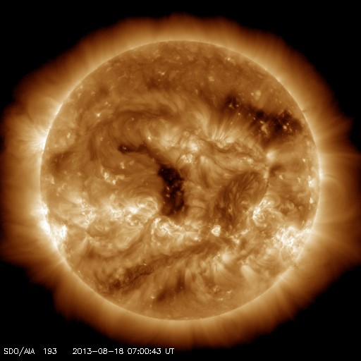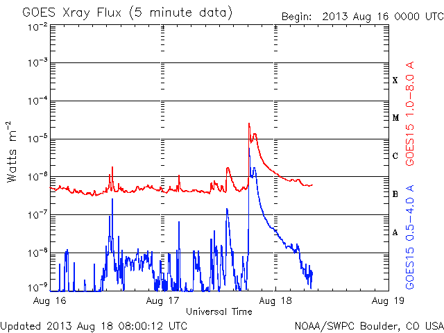 2013/ 8/18 17:04 更新 太陽でM3.3の中規模フレアが発生しました。太陽風の速度は下がりながら高速状態は続いています。 担当 篠原 1818黒点群でMクラスの中規模フレアが発生しました。 18日3時(世界時17日18時)にM3.3と、 18日4時(世界時17日19時)にM1.4です。 X線グラフでは、2つのフレアの山は重なるように起きています。 フレアの様子を、SDO衛星AIA131カメラによる動画で紹介します。 最初に明るい輝きが一瞬起きて、 その後、広い範囲を巻き込むような輝きになっています。 その様子が、GOES衛星のX線データに現れているのでしょう。 このフレアに伴って、CME(太陽ガスの放出現象)も起きています。 SOHO衛星LASCO C2、C3による動画を見て下さい。 太陽から南西方向(右下)に濃くガスが噴き出しています。 しかし、太陽全体を包むように薄く広がっているガスもある様です。 このため、太陽風の乱れは地球方向にも向かっているかもしれません。 地球まで3日程度と考えて、 20日の夜から21日にかけて注目してください。 太陽風は、700km/秒の高速風が来ていましたが、 昨日のニュース以降ゆっくりと下がって、 現在は570km/秒となっています。 高速風は続いていますが、特に速い風ではなくなっています。 磁場強度は3nTに下がっています。 南北成分は、南寄りだったり北寄りだったりしていますが、 振れ幅は小さくなっています。 磁気圏の活動も小規模になっていて、 AE指数は300〜400nTの変化が時々見られる程度です。 SDO衛星AIA193を見ると、コロナホールは西にだいぶ去り、 高速風は後半に入っている様です。 速度はこのまま更に下がっていくと思われますが、 一方、AIA193の太陽の中心には、別のコロナホールが見えています。 この影響が3日後くらいに地球にやってくるかもしれません。 CMEの影響とタイミングが近いので、 混じってしまってよく分からなくなるかもしれません。 放射線帯の高エネルギー電子は、 青線のGOES-15が10,000と高いレベルに達しています。 引き続き増加に注意してください。 ![]() SDO衛星AIA131による、1818黒点群で発生したM3.3のフレア。 (c) SDO (NASA)、 (動画加工 : 宇宙天気ニュース) ![]() Mフレアに伴って発生したCMEの様子。 (c) SOHO (ESA & NASA)、 (動画加工 : 宇宙天気ニュース) ![]() SDO衛星のAIA193カメラによる太陽コロナの様子 (c) SDO (NASA) ![]() SDO衛星による太陽の可視光写真。マウスの矢印を写真に重ねると、黒点番号付きの写真に切り替わります。 (c) SDO (NASA) ![]() GOES衛星の太陽X線データ (c) NOAA/SWPC ![]() | |||||||||||||||||||||||||||||||||||||||||||||||||||||||||||||||||||||||||||||||||||||||||||||||||||||||||||||||||||||||||||||||||||||||||||||||||||||||||||||||||||||||||||||||||||||||||||||||||||||||||||||||||||||||