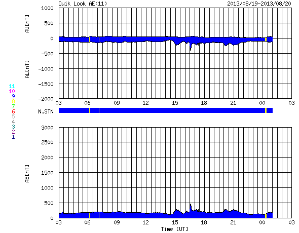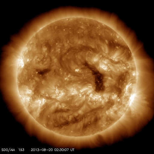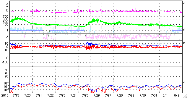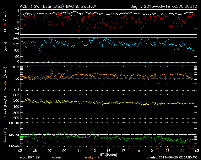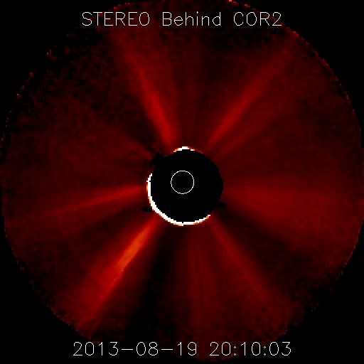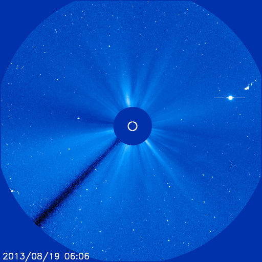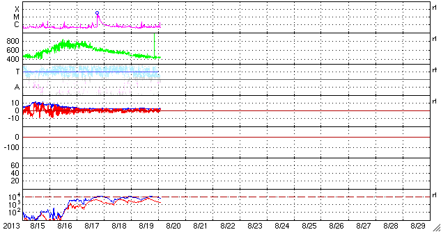 2013/ 8/20 11:32 更新 太陽風速度は450km/秒に下がりました。太陽に彗星が接近しています。 担当 篠原 SOHO衛星のLASCO C2、C3カメラで、 彗星が太陽に接近する様子が撮影されていました。 1枚目にその動画を掲載します。 太陽の右下から、小さい星が少しずつ近づき、 やがて尾を引いて彗星らしくなり、太陽に近づいていきます。 ちょうどそのタイミングに太陽で爆発現象が起きたようで、 太陽全体を包む様に広がるフルハロー型のCMEが発生しています。 LASCO C3(青い写真)では、彗星が引き起こしたようにも見えますが、 LASCO C2(赤い写真)の拡大写真でよく見ると、 彗星が近づく前に爆発は始まっています。 このCMEは太陽の向こう側で起きた現象です。 太陽を左手奥側から観測しているSTEREO Behind衛星の写真を見ると、 CMEは地球のある写真の右側ではなく、 反対の左側に噴き出しています。 まだ進行中の現象なので、 明日のニュースでこの後の動画も紹介できるでしょう。 なお、SOHO衛星のLASCO C3(青い写真)で、 太陽の右上にある明るい星は「水星」です。 また、太陽の左側にはしし座の上半身が見えています。 太陽では、北東から現れた黒点には1828黒点群と番号が付きました。 フレアの発生は、 C2.2、C1.1、C1.0とCクラスに達したのは3つだけですが、 このほかに小さいフレアも頻繁に起きていて、 活動が強まるのかどうか注目してください。 太陽風は、速度が480km/秒から450km/秒へ少しだけ下がり、 高速風の状態は終わった様です。 磁場強度は、3nTと弱めの値で安定しています。 磁気圏の活動も弱まり、 AE指数は小さい変化が所々に見られる程度です。 SDO衛星AIA193を見ると、 中心付近に見えていたコロナホールは、西側(右側)へ進んでいます。 ここから吹き出した高速の太陽風が、 地球に向かっているところでしょう。 到来まで1〜2日程度ではないかと思います。 放射線帯の高エネルギー電子は、 青線のGOES15はまだ10,000に達しています。 太陽風の乱れが来るまで、減少はゆっくりと進みます。