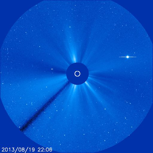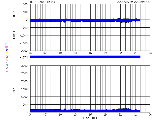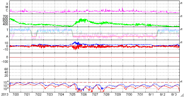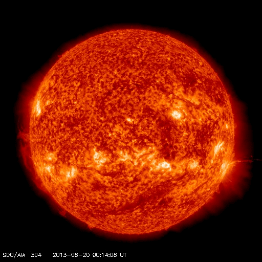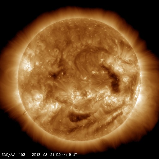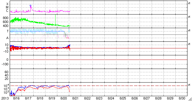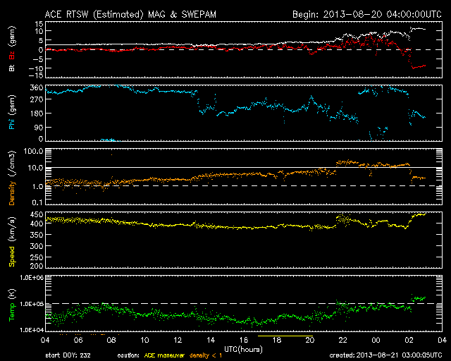2013/ 8/21 12:00 更新 高速太陽風が近づいているようです。オーロラの活動も高まるかもしれません。 担当 篠原 昨日のニュースでお知らせした、 太陽全体を包む様に広がるCMEのその後の様子を動画で紹介します。 更に大きく白いガスの輪が広がる様子を見ることができます。 このCMEは太陽の向こう側で発生しているので、 地球への影響はありません。 そして、動画の後半には、 今度は太陽の南(下側)へ向かって別のCMEが噴き出しています。 こちらは地球側で発生しています。 SDO衛星AIA304の動画を見ると(今日の2枚目の図)、 太陽の南半球で東西に延びていた薄暗い帯(ダークフィラメント)が、 ふわりと浮かび上がるように飛び出しています。 このフィラメント噴出により、2つめのCMEが発生した様です。 このCMEは南向きを中心に広がっているので、 地球への影響は微妙ですが、 到来するのであれば、3〜4日後くらいと考えて、 23〜24日あたりではないでしょうか。 太陽では、C1の小さい小規模フレアが3回起きています。 特に活動の強まりなどは見られません。 太陽風は、昨日から今朝にかけて、 速度は380km/秒へ更に下がって穏やかでしたが、 今朝、21日6時半(世界時20日21時半)から、変化が始まっています。 磁場強度は、5nTを超えて、現在は12nTに強まっています。 速度は、まだ変化は小幅ですが、再び400km/秒台に上がり、 450km/秒に近づいています。 27日周期の図を見ると、この少し前に、 太陽風磁場のセクターが切り替わっています。 27日前の前周期の変化を見ると、 この時もセクターの切り替わり(7月25日)が到来した後に、 太陽風の速度が上昇して、高速風となっています。 今回も、1日ほど早まって同様の変化が起こりそうです。 今後の速度の高まりに注目してください。 また、現在、太陽風磁場の南北成分が、 -10nTと強く南向きに振れています。 南向きに強まる傾向が続けば、磁気圏の活動も活発になります。 放射線帯の高エネルギー電子は、 太陽風の変動を受けて大きく減少しつつあります。