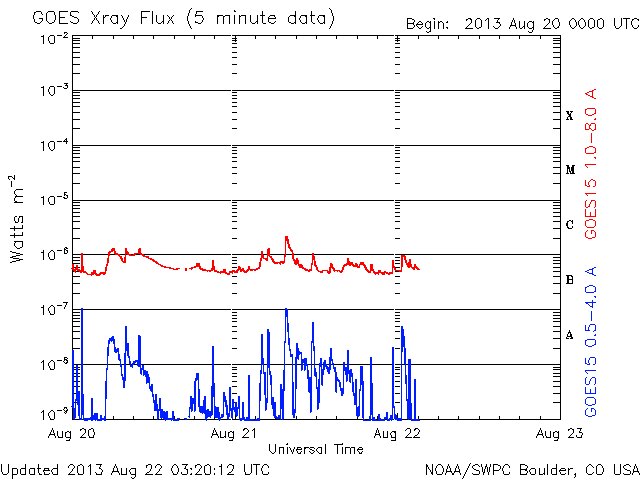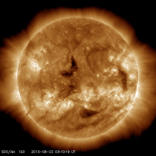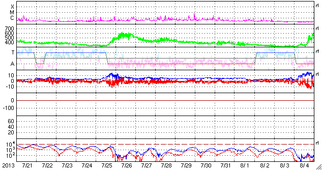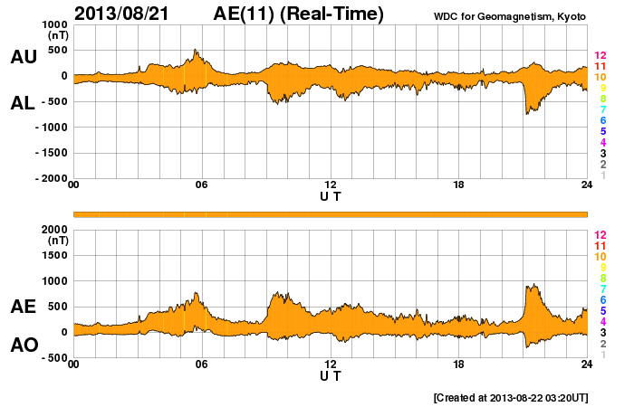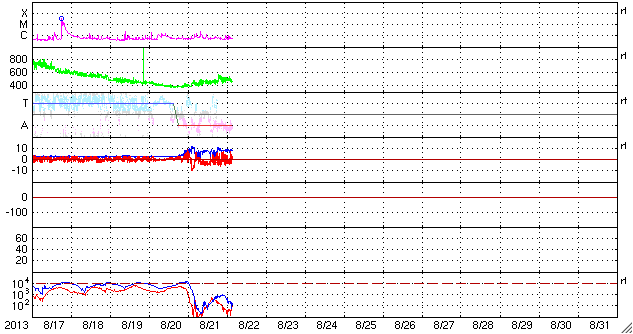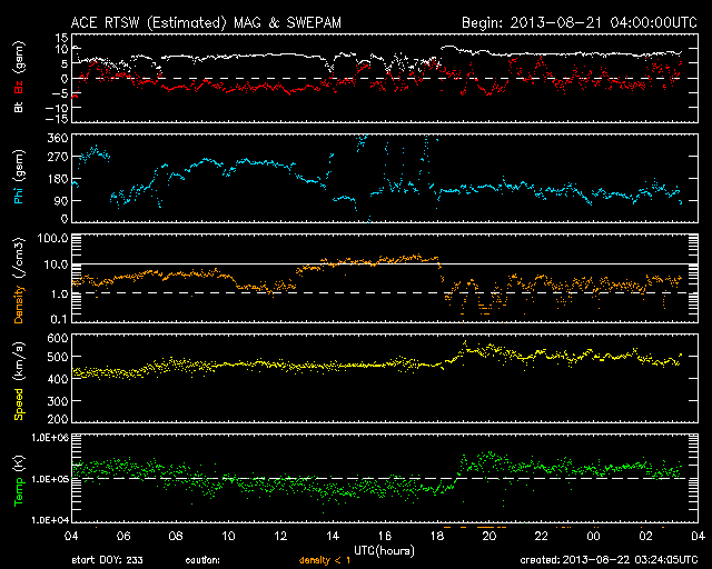 2013/ 8/22 12:21 更新 太陽風の速度は500km/秒に上がり、磁気圏の活動もやや高まっています。 担当 篠原 太陽からCMEの噴出が続いています。 昨日も21日15時(世界時21日6時)ころから、 太陽全体を包む様に広がる、 フルハロー型のCMEが噴き出しています。 GOES衛星のX線カメラを見ると、 21日12時(世界時21日3時)に、 このCMEと関係すると考えられるフレアが、 太陽の南半球側で発生しています。 この動画では、後半に、太陽の左上にある1828黒点群で起きた、 C2.2のフレアによる輝きも見えています。 SOHO衛星の動画では、CMEのガスは淡く、 規模の小さい噴き出しだった様です。 それでも、地球側で発生していますから、 4日後の25日頃の太陽風に影響が見られるかもしれません。 速度の高まりは小さいと思いますが、 磁場強度が強まって、南向きに大きく振れると、 活発なオーロラの活動をもたらします。 太陽は、この他にはC1の小さいフレアが起きている程度です。 太陽風は、昨日始まった乱れがその後も続いています。 速度は更に高まって500km/秒に上がり、高速風となっています。 磁場強度も8nTとやや強まった状態が続いています。 27日周期の図で前周期の太陽風速度の高まりと比べると、 今のところ、今回の山は少し小さくなっています。 (速度の縦軸に違いがあるので注意してください) しかし、磁場強度はまだ強まっているので、 速度はもう一段高まるかもしれません。 磁気圏では、 700〜900nTに達する中規模の活動が度々発生しています。 太陽風の強まりは続いているので、 磁気圏活動も高めの状態が続く可能性があります。 ![]() 太陽をつつむ様に広がる、フルハロー型のCMEが発生しました。 (c) SOHO (ESA & NASA)、動画作成 : 宇宙天気ニュース ![]() CMEに関係すると思われる、太陽の南半球側で発生したフレア。 (c) NOAA/SWPC 、(動画加工 : 宇宙天気ニュース) ![]() 日本時間8月21日9時から22日9時(世界時8月21日0〜24時)のAE指数。 (c) 京都大学WDC ![]() SDO衛星のAIA193カメラによる太陽コロナの様子 (c) SDO (NASA) ![]() SDO衛星による太陽の可視光写真。マウスの矢印を写真に重ねると、黒点番号付きの写真に切り替わります。 (c) SDO (NASA) ![]() GOES衛星の太陽X線データ (c) NOAA/SWPC ![]() ACEが観測した太陽風の磁場(1番上の枠、白線は全体の強度、赤線は南北成分) および、太陽風の密度(3番目の橙線)、速度(4番目の黄線) (c) NOAA/SWPC ![]() 27日の太陽周期に合わせたデータプロット 太陽が同じ面を地球に向けていた27日前の変化から、今後を予想することができます。 (c) 作図:宇宙天気ニュース