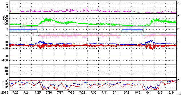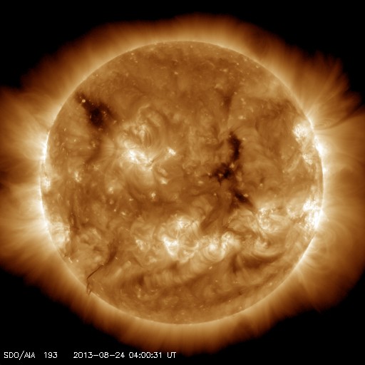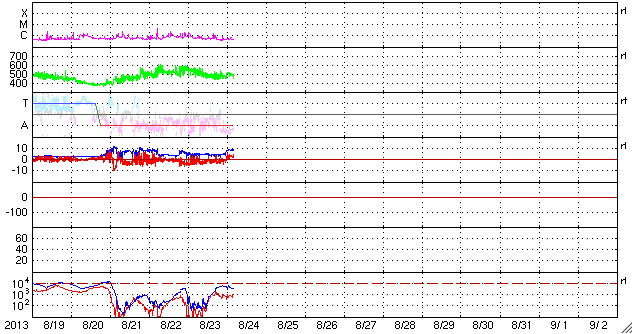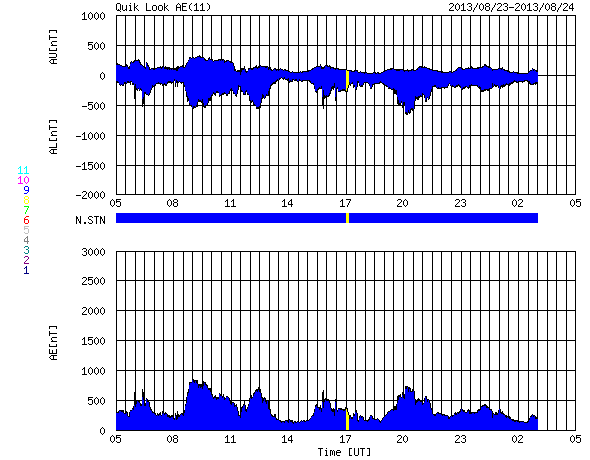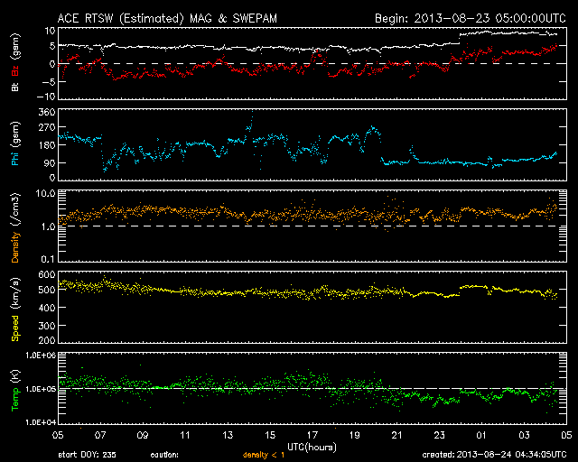 2013/ 8/24 13:35 更新 高速の太陽風は続いています。小さい彗星が再び太陽に接近しています。 担当 篠原 8月20日のニュースで紹介したばかりですが、 また別の彗星が太陽に接近しています。 SOHO衛星LASCO C2、C3の動画を見て下さい。 右下から小さい星がゆっくりと太陽に近づき、 やがて細い尾をひいて、太陽に向かって行きます。 最接近の後どうなったかは、この写真だけでは分かりません。 通り道も似ているので、前の彗星と同じグループなのでしょう。 4日の差で、連続してやって来ました。 太陽風は、500km/秒を少し割ったくらいの速度を保っていて、 通常よりも高速の風は続いています。 磁場強度は、5nTから、今朝になって一段強まり、 8nTに上がっています。 変化の様子から、CMEの影響が到来したのではないでしょうか。 磁場の南北成分は、前半は南寄りに推移していましたが、 磁場の強まり以降は、北向きに変わっています。 このため、オーロラの活動度を表すAE指数の変化は、 前半は500〜800nTと中規模の変化が起きていましたが、 後半は変化は弱くなっています。 CMEによる擾乱であれば、 この後に磁場の方向が大きく切り替わる可能性があります。 南向きに振れると、再び磁気圏の活動が強まるでしょう。 27日周期の図を見ると、太陽風速度の変化は、 前周期と似たようになっています。 そう考えると、速度の高い太陽風も今日までで、 明日以降は平均的な状態にもどりそうです。 太陽は、C1の小さいフレアが3回ほど発生しているだけで、 活動度は弱まっています。 黒点も、目立った群は西へ去り、 太陽面はだんだん寂しくなっています。