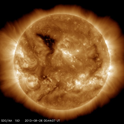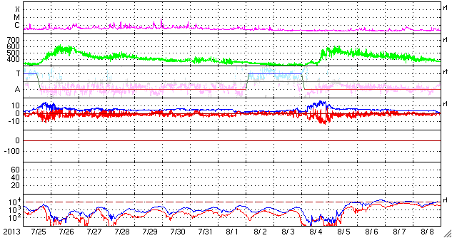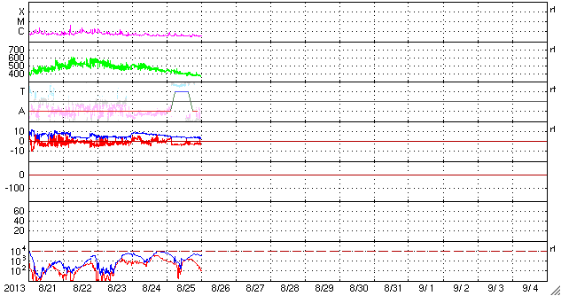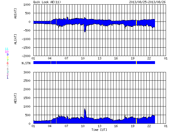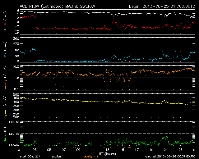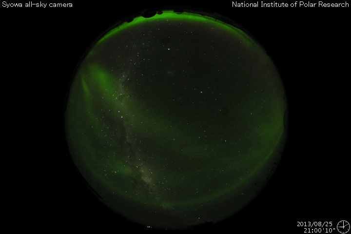 2013/ 8/26 09:58 更新 太陽風は400km/秒と平均的な状態です。太陽も静穏です。 担当 篠原 昭和基地の全天カメラで、きれいなオーロラが撮影されていました。 月の明るさがなくなってきたので、 空が暗くなり、オーロラの輝きは一層きれいに写っています。 太陽風の速度は、もう一段下がって、 400km/秒か、それを割るくらいになっています。 平均的な速さで落ち着いています。 磁場強度は5nTから4nTへ少し下がり、 最後のところで3nTになっています。 南北成分は、昨日の昼頃から南向きに振れ、 現在まで-3nTの南向きがずっと続いています。 磁気圏は、この影響で小規模の活動が続いている様で、 AE指数のグラフは、400nT前後の弱い変化がずっと続いています。 昭和基地の動画はこの図の終わり頃、 世界時25日23時前後の様子です。 太陽風は、しばらく穏やかな風が続きそうです。 磁気圏も基本的には静穏な状態になるでしょう。 太陽も、X線グラフには小さい変化しか見られず、静穏です。 東から現れた黒点も、穏やかの様です。