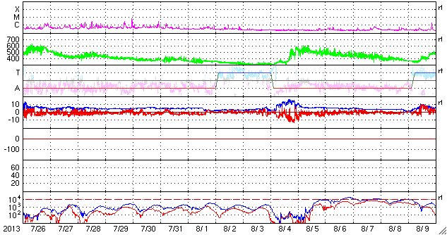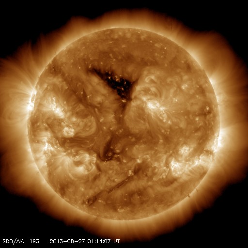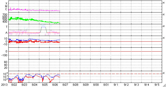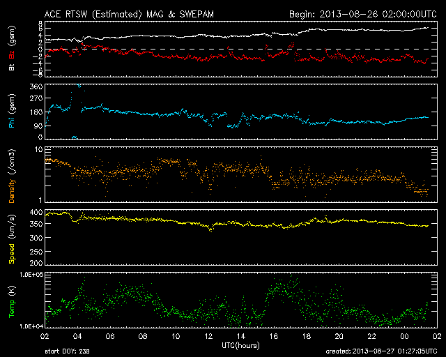 2013/ 8/27 10:25 更新 太陽風は低速の風になっています。太陽の活動も静かです。 担当 篠原 太陽風の速度は、400km/秒から350km/秒へ更に下がり、 低速の風になっています。 磁場強度は、3nTから5nTに上がっていますが、 平均的な値に戻った程度です。 一方、南北成分は南向きに振れた状態が続いています。 現在は、-3nTと強くはありませんが、 磁場強度の強まりと一緒に上がっている感じです。 磁気圏では、小規模の活動が時々起きています。 AE指数は、300〜500nTの変化が起きています。 太陽風磁場の南向きが続けば、 こちらの変動も続くでしょう。 SDO衛星AIA193を見ると、 太陽の北半球の正面に 三角形をしたコロナホールが見えています。 ここからの影響で、 3日後の30日くらいに 高速の太陽風がやってくるかもしれません。 27日周期の図を見ると、 前周期は8月4日に高速風が始まっていて、 この27日後だと、31日になります。 今回はどのタイミングでやって来るでしょうか。 太陽は、X線のグラフに変化はなく、 とても静かです。 東端から、また新しい黒点群が現れています。 ![]() SDO衛星のAIA193カメラによる太陽コロナの様子 (c) SDO (NASA) ![]() SDO衛星による太陽の可視光写真。マウスの矢印を写真に重ねると、黒点番号付きの写真に切り替わります。 (c) SDO (NASA) ![]() ACEが観測した太陽風の磁場(1番上の枠、白線は全体の強度、赤線は南北成分) および、太陽風の密度(3番目の橙線)、速度(4番目の黄線) (c) NOAA/SWPC ![]() リアルタイムAE指数 下段のAEグラフの値が高くなると、オーロラ活動が活発化しています。 (c) 京都大学, NICT ![]() 27日の太陽周期に合わせたデータプロット 太陽が同じ面を地球に向けていた27日前の変化から、今後を予想することができます。 (c) 作図:宇宙天気ニュース