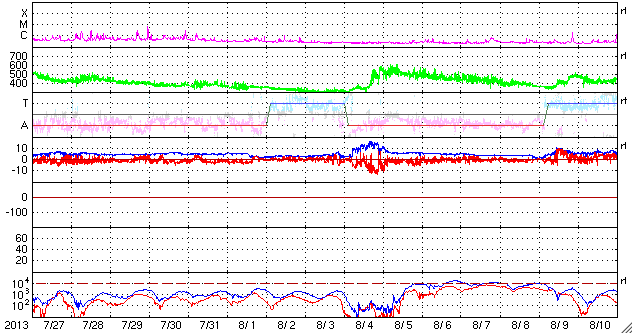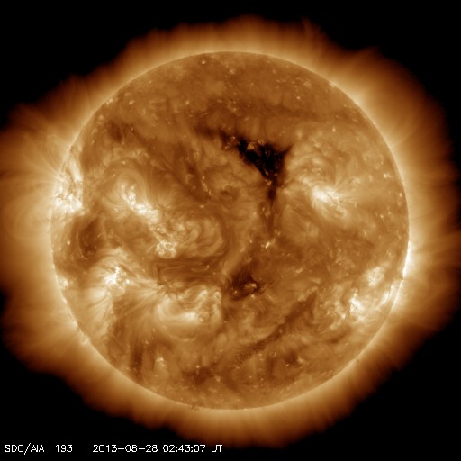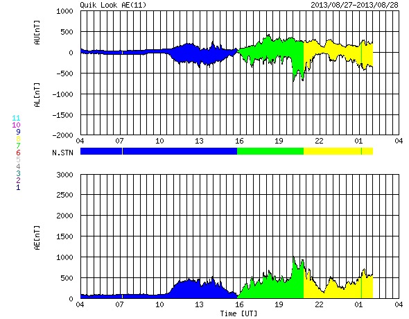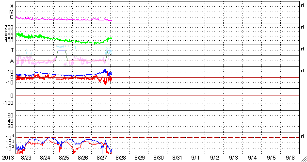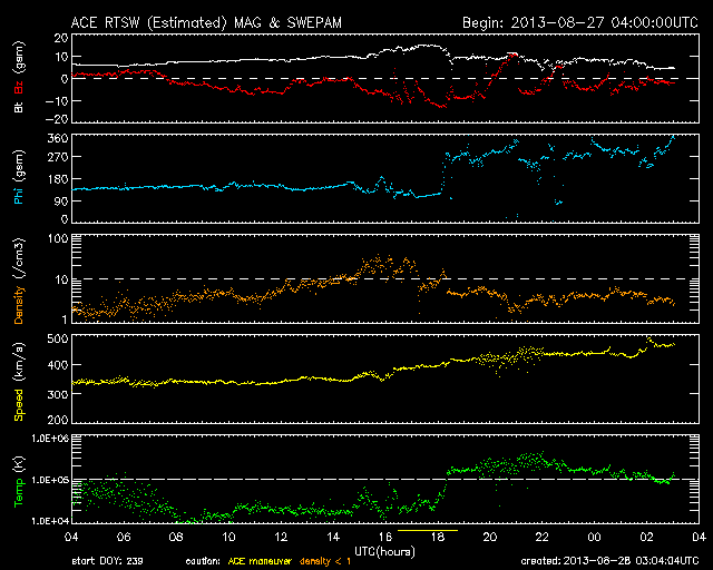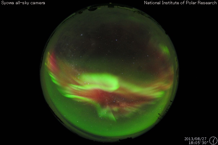 2013/ 8/28 12:05 更新 太陽風磁場の強まりにより、オーロラの活動が強まっています。 担当 篠原 一足早く、太陽風の乱れがやって来ました。 昨日のニュースの後も、 太陽風の磁場強度は次第に強まり、 28日2時(世界時27日17時)に、15nTへ達しました。 その後は、10nTと強まった状態が8時間ほど続き、 現在はまた下がって、5nTと平均的な値に戻っています。 磁場強度の強まりとともに、 太陽風の速度も高まっています。 350km/秒の低速風から、 グラフの最後では470km/秒とやや高速の風に上がっています。 磁場が強まっていた間、 南北成分は南寄りで変化していました。 磁場が最も強まった頃には、 -10nTまで南向きに強まっています。 このため、磁気圏の活動も強まって、 AE指数は、500nTから1000nTの中規模の変動が続いています。 その中の、世界時27日18時に撮影された、 昭和基地のオーロラを紹介します。 緑色と赤色の明るいオーロラが、 空を横切って輝いています。 今日は動画を掲載できないのが残念です。 27日周期の図を見ると、 今回の太陽風の乱れは、前周期にはありませんでした。 SDO衛星AIA193のコロナホールとのつながりなど、 この後の変化に注目してください。 太陽は、目立った変化はなく穏やかです。 ![]() 南極の昭和基地で、世界時27日18時に撮影されたオーロラ。 (c) 国立極地研究所 ![]() SDO衛星のAIA193カメラによる太陽コロナの様子 (c) SDO (NASA) ![]() SDO衛星による太陽の可視光写真。マウスの矢印を写真に重ねると、黒点番号付きの写真に切り替わります。 (c) SDO (NASA) ![]() ACEが観測した太陽風の磁場(1番上の枠、白線は全体の強度、赤線は南北成分) および、太陽風の密度(3番目の橙線)、速度(4番目の黄線) (c) NOAA/SWPC ![]() リアルタイムAE指数 下段のAEグラフの値が高くなると、オーロラ活動が活発化しています。 (c) 京都大学, NICT ![]() 27日の太陽周期に合わせたデータプロット 太陽が同じ面を地球に向けていた27日前の変化から、今後を予想することができます。 (c) 作図:宇宙天気ニュース