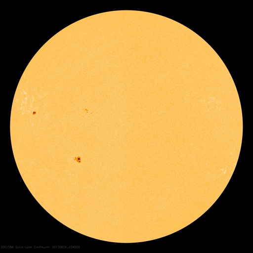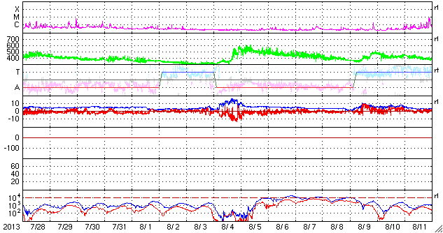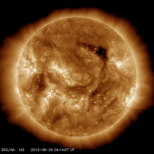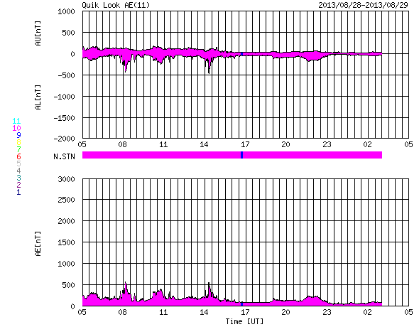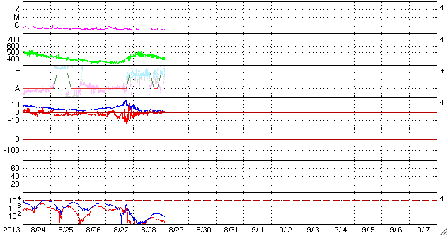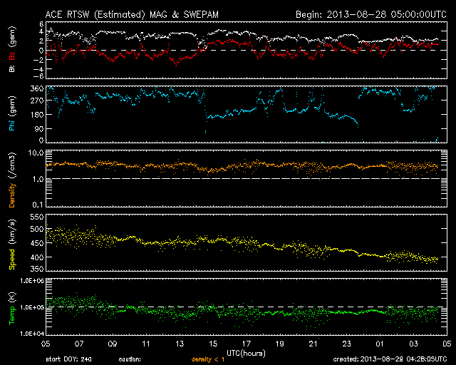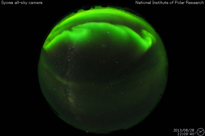 2013/ 8/29 13:29 更新 太陽風は平均的な速度に戻っています。太陽も静かです。 担当 篠原 太陽風の速度の高まりは、 昨日の昼の480km/秒が最高で、 その後はゆっくりと下がって、 現在は400km/秒と平均的な速さに戻っています。 速度の変化は小規模で、1日程度で終わった様です。 太陽風の磁場強度も、 3nTに下がって安定しています。 太陽風は穏やかになっています。 太陽風磁場の南北成分は、 北向きと南向きにゆっくりと変化しています。 しかし、振れ幅が小さいので、磁気圏への影響は弱く、 AE指数は度々変化していますが、 300nTから500nTと小規模です。 その変化のひとつとして、 南極の昭和基地のオーロラ写真を掲載します。 昨日のオーロラと比べると、 地平線の近くに小さく寄っていて、 緑色の光だけが見えているだけです。 SDO衛星のAIA193では、 北半球のコロナホールは西側へ移動して、 影響が始まるタイミングに近づいています。 また改めて、高速の太陽風が始まるのではないでしょうか。 太陽は、フレアの活動はなく、 穏やかな状態が続いています。