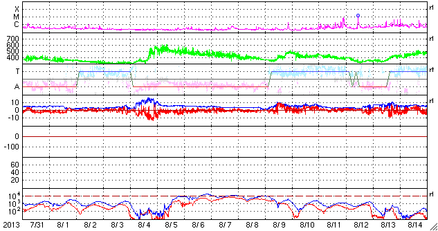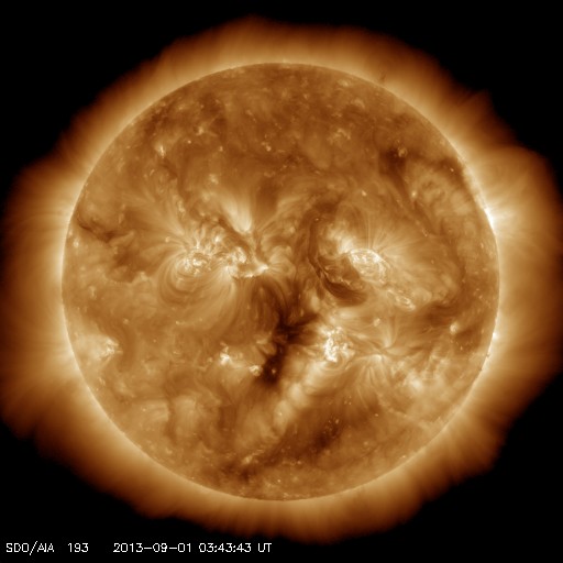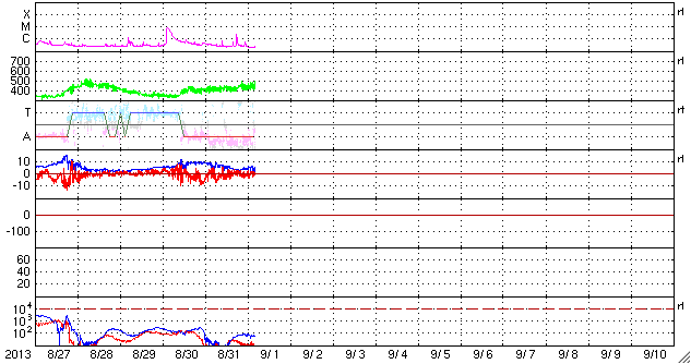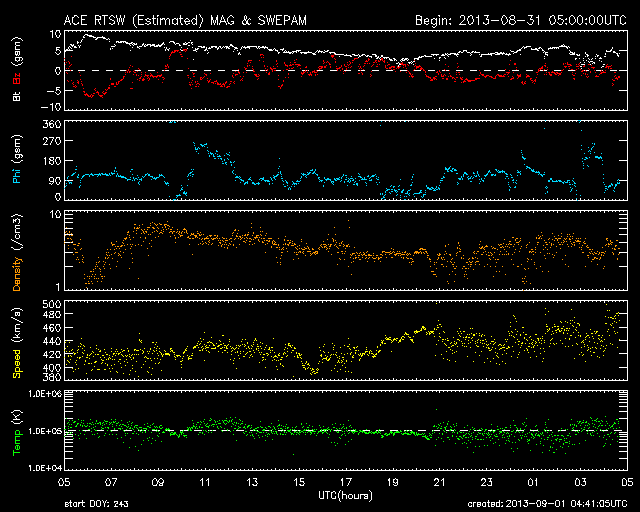 2013/ 9/ 1 13:41 更新 太陽風は440km/秒にやや上がっています。ムルマンスクのオーロラをどうぞ。 担当 篠原 今日は北極と南極のオーロラを紹介します。 1枚目は、ロシア連邦ムルマンスク市の福島さんよりお送り頂いた、 ムルマンスク州中部キーロフスク市在住の ジガーノフ氏によるオーロラの写真です。 昨日(31日)の朝に届いたので、8月30日の撮影ではないかと思います。 薄雲を通しての撮影だったそうですが、 緑やピンク色の鮮やかなオーロラが空を飾っています。 オーロラの季節が北半球に移ろうとしているのだと実感します。 どうもありがとうございます。 そして、2枚目は南極の昭和基地の全天カメラによるオーロラです。 世界時で9月1日に入ってすぐに活発になったオーロラです。 過去の観測記録を見ると、 昭和基地の撮影は10月上旬まで続けられています。 こちらのオーロラ観望は、残り1ヶ月半の様です。 太陽風の変化は、440km/秒に速度が上がったくらいで、 頭打ちになっています。 磁場強度も既に5nTに下がっていて、これ以上の変化はなさそうです。 前周期のような、しっかりした高速風は来ませんでした。 磁場の南北成分は、やや南寄りの傾向が続いていて、 AE指数500nT前後の活動が度々発生しています。 掲載している動画は、その変化の最後の山の一部です。 注目していたコロナホールは、既に西の端に遠ざかっているので、 太陽風は次第に穏やかになるでしょう。 一方、昨日紹介したCMEの影響が明日くらいに到来するかもしれません。 太陽風の乱れが到来して磁場が強く南を向くと、 磁気圏の活動も高まるでしょう。 また、SDO衛星AIA193を見ると、 まん中の南半球側に小さいコロナホールが見えています。 3〜4日後くらいにある程度の影響がやって来るかもしれません。 太陽では、1836黒点群でC2.6の小規模フレアが発生しています。 目立った活動はこれだけで、全体としては穏やかな状態です。 ![]() ムルマンスク州中部キーロフスク市在住のジガーノフ氏の撮影によるオーロラ。 (c) 福島留美氏、ジガーノフ氏 ![]() 9月1日の南極・昭和基地のオーロラ。 (c) 国立極地研究所、(動画加工 : 宇宙天気ニュース) ![]() SDO衛星のAIA193カメラによる太陽コロナの様子 (c) SDO (NASA) ![]() SDO衛星による太陽の可視光写真。マウスの矢印を写真に重ねると、黒点番号付きの写真に切り替わります。 (c) SDO (NASA) ![]() ACEが観測した太陽風の磁場(1番上の枠、白線は全体の強度、赤線は南北成分) および、太陽風の密度(3番目の橙線)、速度(4番目の黄線) (c) NOAA/SWPC ![]() リアルタイムAE指数 下段のAEグラフの値が高くなると、オーロラ活動が活発化しています。 (c) 京都大学, NICT ![]() 27日の太陽周期に合わせたデータプロット 太陽が同じ面を地球に向けていた27日前の変化から、今後を予想することができます。 (c) 作図:宇宙天気ニュース