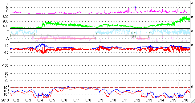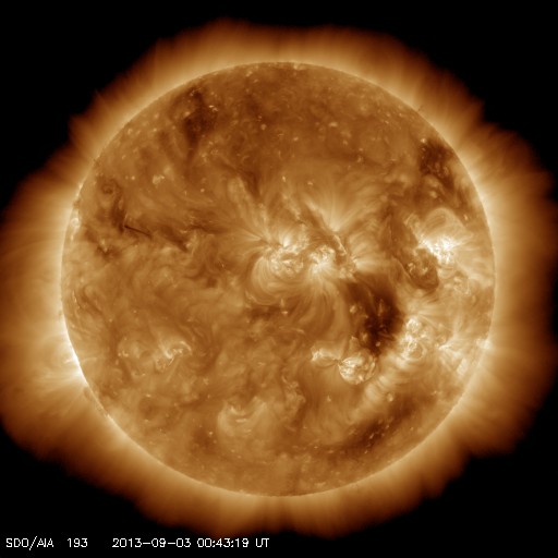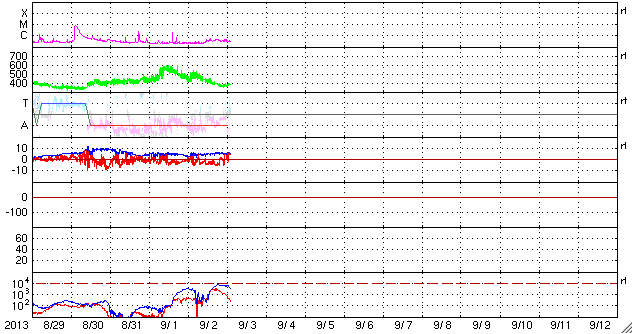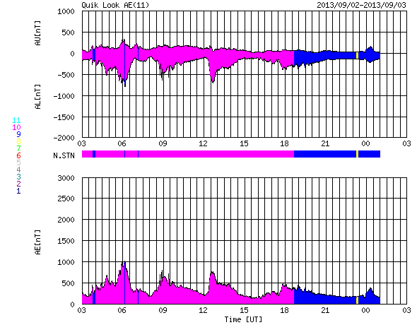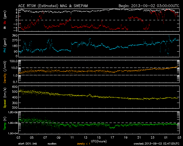 2013/ 9/ 3 11:47 更新 太陽風は平均的な状態に戻っています。太陽は穏やかです。 担当 篠原 太陽風の速度は、昨日のニュース以降はゆっくりと下がり、 今日の未明には400km/秒と平均的な速さに戻りました。 また、磁場強度は5nTで安定しています。 太陽風磁場の南北成分は、 昨日いっぱいは南寄りの傾向が続きました。 このため、AE指数は700〜1000nTの 中規模の変化が数回発生していて、 磁気圏はある程度活発だった様です。 その後、磁場の方向は北寄りに変わり、 現在のAE指数は変化が小さくなっています。 27日周期の図を見ると、 太陽風磁場の大まかな方向が切り替わるセクター境界に 差し掛かっているのかもしれません。 太陽風の速度は落ち着きましたが、 SDO衛星AIA193の太陽の中心の右下には、 小さいコロナホールがあります。 ここからの影響が、明日以降ある程度見られるかもしれません。 太陽は、中央の南側に現れた黒点に、 1837群と番号が付きました。 フレアの活動は特になく、穏やかです。