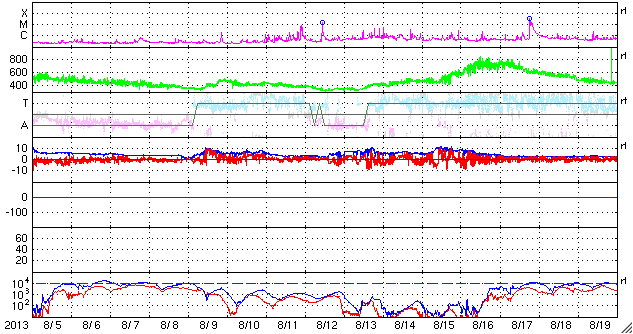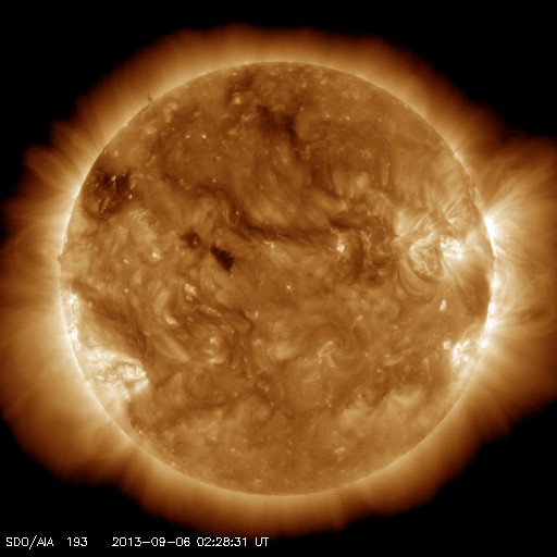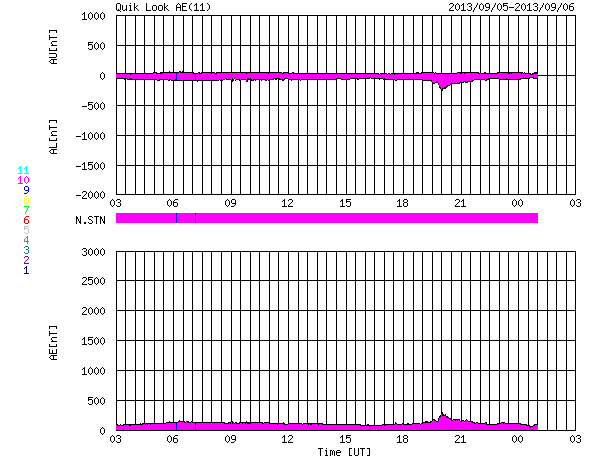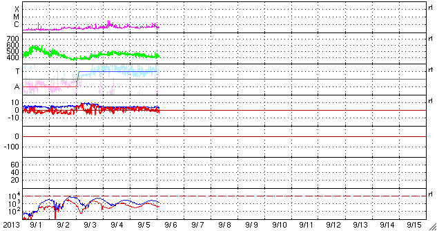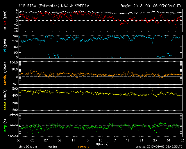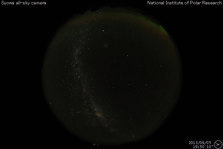 2013/ 9/ 6 11:45 更新 太陽風は平均的な状態です。太陽の活動も穏やかです。 担当 篠原 太陽風の速度は、ゆっくりと下がって、 そろそろ400km/秒に戻りつつあります。 磁場強度も、4〜5nTで安定していて、 太陽風は平均的な状態です。 太陽風磁場の南北成分は、北寄りから、 現在は0nT付近で推移するようになっています。 磁気圏は静穏ですが、北寄りが弱まったために、 AE指数の後半に小さい活動が起きています。 その頃の、南極の昭和基地の空を見て下さい。 写真の上の地平線近く(より高緯度側の空)の、 空の低いところでオーロラの光がゆっくりと動いています。 太陽風は、しばらく穏やかに推移しそうです。 SDO衛星AIA193を見ると、太陽の北東端(左上)に、 コロナホールが淡く見えています。 このコロナホールは、27日前はこれよりも濃く見えていたのですが、 現在はどのようになっているのでしょうか。 明日以降の写真に注目して下さい。 太陽は、東の端から1838黒点群が顔を出しました。 一方、西の端に近づいた1836、1837黒点群で、 C1程度の小さいフレアが起きています。 太陽は、全体としては穏やかです。 今日の夕方から月曜日の午前中にかけて、 学内のネットワークの停止により、 ニュースを見ることができなくなります。 来週は、ロシア・カムチャッカ半島から更新します。 ![]() 南極の昭和基地で全天カメラにより撮影された、地平線近くのオーロラ。 (c) 国立極地研究所、(動画加工 : 宇宙天気ニュース) ![]() SDO衛星のAIA193カメラによる太陽コロナの様子 (c) SDO (NASA) ![]() SDO衛星による太陽の可視光写真。マウスの矢印を写真に重ねると、黒点番号付きの写真に切り替わります。 (c) SDO (NASA) ![]() ACEが観測した太陽風の磁場(1番上の枠、白線は全体の強度、赤線は南北成分) および、太陽風の密度(3番目の橙線)、速度(4番目の黄線) (c) NOAA/SWPC ![]() リアルタイムAE指数 下段のAEグラフの値が高くなると、オーロラ活動が活発化しています。 (c) 京都大学, NICT ![]() 27日の太陽周期に合わせたデータプロット 太陽が同じ面を地球に向けていた27日前の変化から、今後を予想することができます。 (c) 作図:宇宙天気ニュース