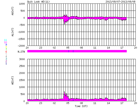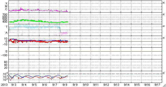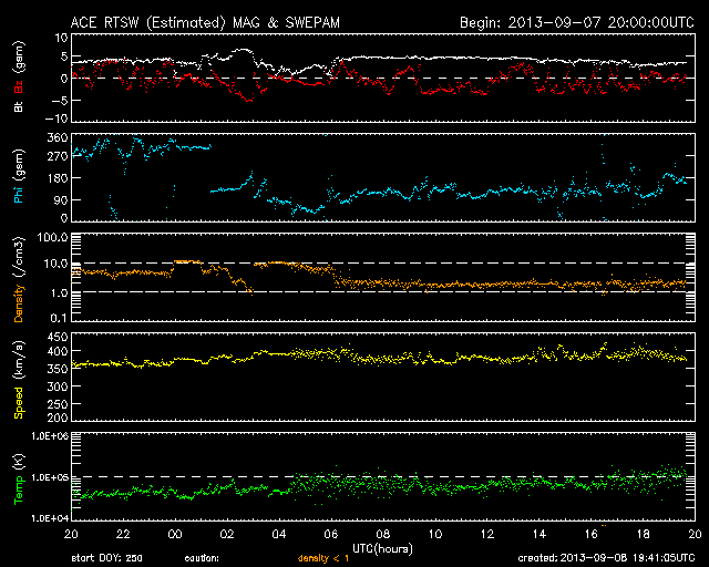 2013/ 9/ 9 04:41 更新 太陽風は400km/秒近くで安定しています。太陽も穏やかです。 担当 篠原 太陽風は、400km/秒を少し割るくらいの速度で安定しています。 磁場強度は、少し弱めの3nTで落ち着いています。 昨日のニュースで書いたように、 太陽風磁場の大まかな方向が切り替わる、 セクター境界が来ています。 27日周期の図を見ると、「T」から「A」に変わっています。 磁気圏は穏やかな状態が続いています。 AE指数の図は、中央に600nTの変化が一度起きているだけです。 27日周期の図で、太陽風の前周期の変化を見ると、 今日、明日のうちに再びセクターの切り替わりが発生しそうです。 速度はしばらく穏やかに推移しそうですが、 3日くらい経つとコロナホールの影響で、速度が上がりそうです。 SDO衛星AIA193を見ると、コロナホールの先頭(右端)は、 太陽の中心線に達しようとしています。 太陽では、南東の1838黒点群で、 Bクラスの小さい活動が発生した様です。 その他に目立った変化はなく、 全体としては穏やかな状態が続いています。 今日は、ウラジオストック国際空港で書いています。 現地の午前1時半に到着して、 カムチャッカへの乗り継ぎ便が7時半なので、 そのままターミナルで夜明かしをしています。 空港の建物は、一昨年に来た時とは違う場所に新しく作られていて、 広くてきれいです。 夜中は店も閉まってしまい何もありませんが、 (徹夜ですが)楽に夜明かしをすることができました。 日本ではまだ早朝ですが、可能なうちに記事を更新しておきます。 これからカムチャッカです。