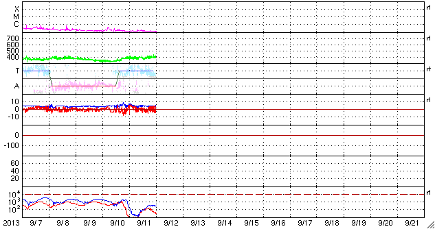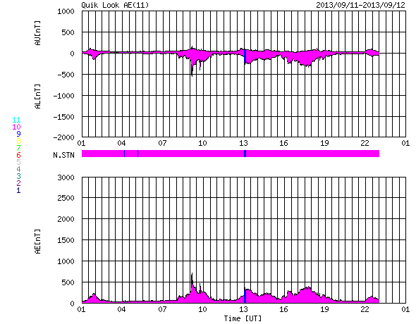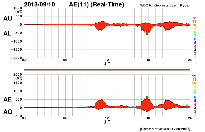 (c) NOAA/SWPC ![]() 2013/ 9/12 09:37 追加 3日間の太陽風データ。黄色線は速度、白線は磁場強度、赤線は南北成分。 (c) NOAA/SWPC ![]() 世界時9月10日のAE指数。 (c) 京都大学WDC ![]() | |||||||||||||||||||||||||||||||||||||||||||||||||||||||||||||||||||||||||||||||||||||||||||||||||||||||||||||||||||||||||||||||||||||||||||||||||||||||||||||||||||||||||||||||||||||||||||||||||||||||||||||||||||||
