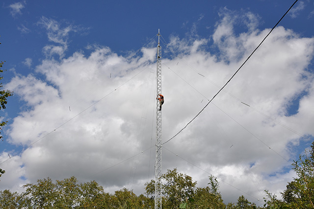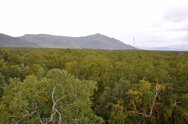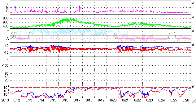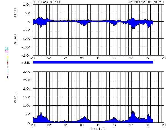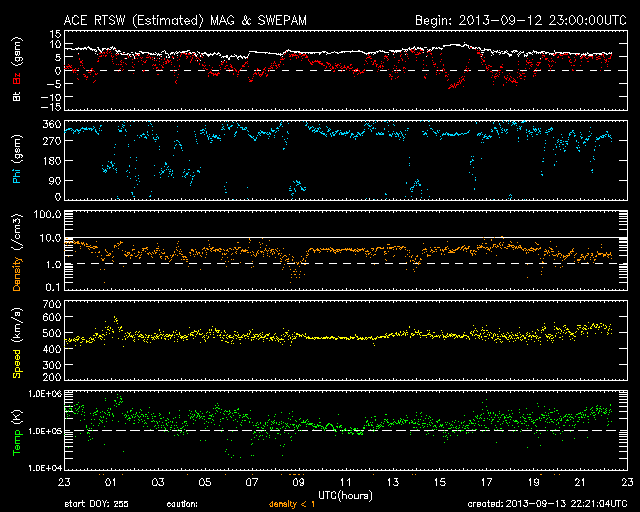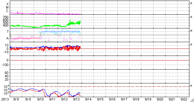 2013/ 9/14 07:21 更新 太陽風は500km/秒台の高速風になっています。フィンランドのオーロラをどうぞ。 担当 篠原 今日はフィンランドのオーロラを紹介します。 9月3〜4日にフィンランドで撮影したオーロラの写真を 谷口直樹さんよりお送りいただきました。 滞在中のフィンランドは雲が多く、観測はかなり難しかったそうです。 雲を避けるために、急遽、観測場所を50km移動することもあったそうです。 この様な中で観測できたのが9月3日と4日のオーロラだそうですが、 1枚目の写真では、雲越しにオーロラの激しい動きが見えたそうで、 印象的な緑色の光が写っています。 2枚目は、西の空に残る夕暮れの赤い光とオーロラの共演です。 右の方に、ぎょしゃ座やペルセウス座も写っています。 この夜は、明け方まで薄いオーロラが見え続けていたそうです。 観測条件が宇宙の天気と地上の天気の掛け合わせになるので、 オーロラを見るということは簡単ではないのだなと実感します。 素敵な写真をどうもありがとうございました。 太陽風は、昨日から少し速度が上がって、 520km/秒とより高速になっています。 磁場強度は7nTを前後していて、まだ少し強まったままです。 このため、速度はもう一段高まるかもしれません。 磁気圏では中小規模の活動が度々発生していて、 AE指数は300〜600nTの山が数時間おきに発生しています。 極域ではオーロラの観測もできているのではないでしょうか。 SDO衛星AIA193では、北半球のコロナホールは、 太陽の中央線を通り過ぎましたが、 後半部の影響はまだこれからやってきます。 前周期と同様に、高速風は3〜4日程度続くのではないでしょうか。 太陽は、静穏な状態が続いています。 X線のグラフは全く変動がありません。 黒点も、東西にそれぞれ小さく見えているだけです。 昨日は、電離圏観測用の短波レーダーのタワーに登りました。 高さ20mほどですが、久しぶりの登頂だったので緊張しました。 上まで登ってしまえば、なかなかの高度感で気持ちいいです。 周囲は深い森がどこまでも続いています。 作業中は、天気は良かったつもりだったのですが、 登り始めると急に雲がやってきて、にわか雨に降られ、 降りると止んで晴れ渡るという、間の悪い流れでした。 カムチャッカの滞在は明日までです。 ウラジオストック経由で日本に帰ります。