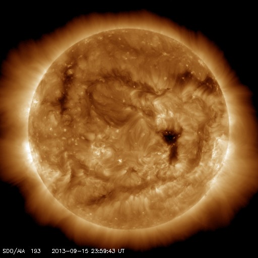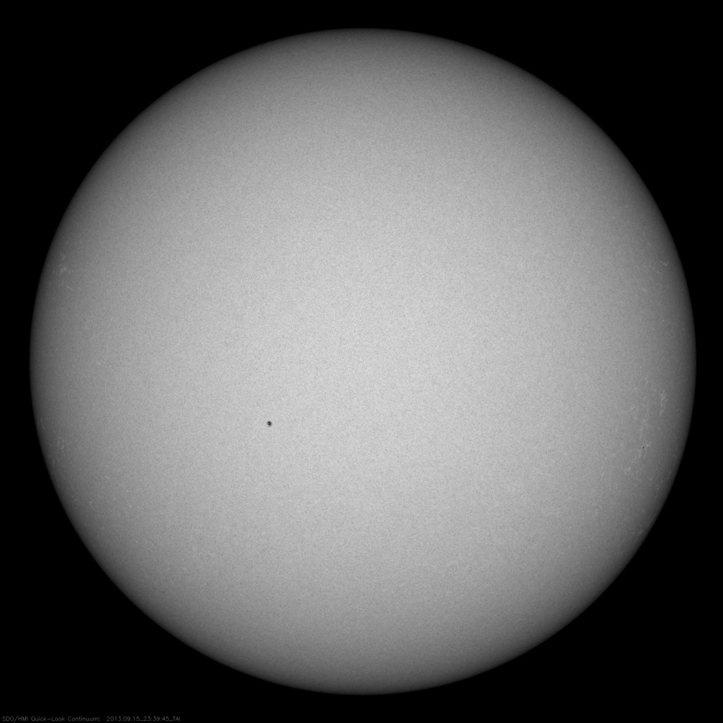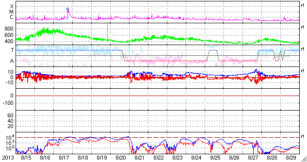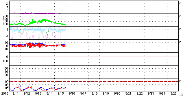 2013/ 9/16 09:15 更新 太陽風はやや低速になっています。磁気圏も静穏です。 担当 篠原 太陽風の速度は、昨日以降もそのまま下がり続け、 昨夜、400km/秒を割り、 現在は370km/秒とやや低速の風になっています。 高速の太陽風は、2日程度で終わってしまいました。 太陽風の磁場強度も、 3nTから4nTに変化する程度で、穏やかです。 磁気圏も静穏で、AE指数はほとんど変化していません。 SDO衛星AIA193の太陽コロナ写真では、 太陽の中心の少し右側に小さいコロナホールがあります。 27日周期の図を見ると、 前周期の8月22日頃に小さい速度の山が到来しています。 このような変化が今回も見られる可能性があります。 太陽は、X線のグラフにほとんど変化はなく、 穏やかな状態が続いています。 黒点は、中央のやや左にひとつ、1841黒点群の黒点と、 右の端にかろうじてもうひとつ、小さい黒点が見えるだけです。 いつもより大きいサイズの太陽写真を掲載するので、 見つけてください。 今日は羽田空港で更新しています。 台風18号の影響で予約していた便が欠航し、 便を変更してかろうじて搭乗口まで来ることができたのですが、 出発時刻まであと少しのところで見合わせになっています。 この後、どうなるのでしょうか。 ![]() SDO衛星による、16日8時半(世界時15日23時半)の太陽。中央と右端に小さい黒点がふたつ見えるだけです。 (c) SDO (NASA) ![]() SDO衛星のAIA193カメラによる太陽コロナの様子 (c) SDO (NASA) ![]() SDO衛星による太陽の可視光写真。マウスの矢印を写真に重ねると、黒点番号付きの写真に切り替わります。 (c) SDO (NASA) ![]() ACEが観測した太陽風の磁場(1番上の枠、白線は全体の強度、赤線は南北成分) および、太陽風の密度(3番目の橙線)、速度(4番目の黄線) (c) NOAA/SWPC ![]() リアルタイムAE指数 下段のAEグラフの値が高くなると、オーロラ活動が活発化しています。 (c) 京都大学, NICT ![]() 27日の太陽周期に合わせたデータプロット 太陽が同じ面を地球に向けていた27日前の変化から、今後を予想することができます。 (c) 作図:宇宙天気ニュース