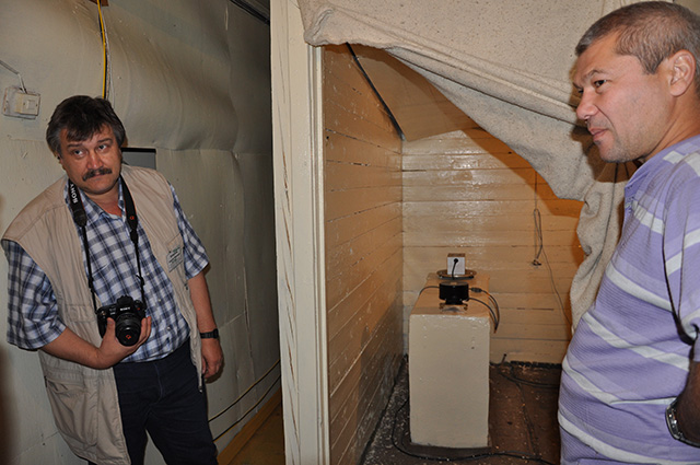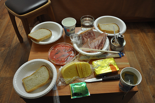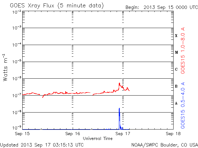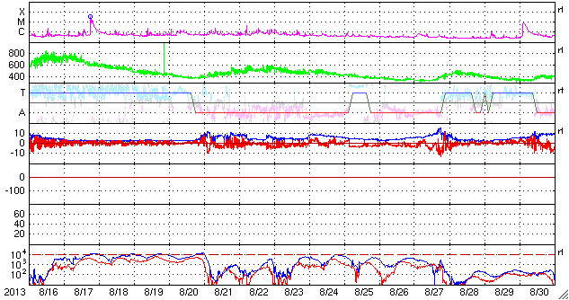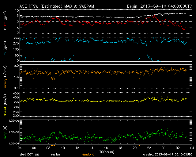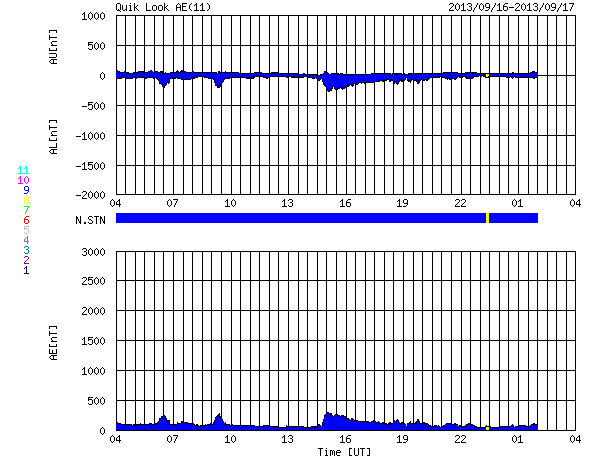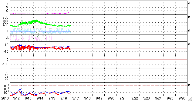 2013/ 9/17 12:12 更新 太陽風はやや低速ですが、磁場強度が少し強まっています。 担当 篠原 太陽は、穏やかな状態が続いています。 北西(右上)には、小さい黒点が新しく現れています。 X線グラフでは、Bクラスの小さい変化が起きています。 この変化は、太陽の東端で起きていて、 ここから新しい黒点が現れるかもしれません。 太陽風の速度は、370km/秒付近とやや低速で安定しています。 磁場強度は4nTが続いていましたが、 ACEのグラフの最後で7nTに少し強まっています。 27日周期の図の前周期と同じように、 ここで小規模の太陽風の乱れがやって来るのかもしれません。 この後、速度もやや高まる可能性があります。 現在の磁気圏は静穏で、 AE指数は小規模の変化が時々起きている程度です。 太陽風は、磁場が少し強まりながら、 南北成分は南向きに振れています。 この傾向が続くと、オーロラの活動もやや活発になるでしょう。 更に、磁場強度が高まったり、速度が上がる様だと、 磁気圏の活動ももう一段高まります。 昨日は、台風到来前の最後の離陸組に入れた様子で、 予定より30分遅れになりましたが、 10時過ぎに鹿児島へ飛び立つことができました。 今日は久しぶりに高専で更新しています。 カムチャッカ半島パラツンカ出張の最後の紹介として、 磁力計の写真を掲載します。 研究所の建物から少し離れた林の中に、 磁力計を設置するための観測小屋が作られています。 その中に、九州大学の磁力計が置かれています。 磁力計は、とても敏感なセンサー部分だけを、 もう一つ別の磁気を帯びていない小屋の中に置き、 電気回路の部分をこちらの小屋の中に分けて置きます。 装置は順調に動いているので、 今回の滞在では特に行う作業はありませんでした。 そしてもう一枚。 一昨日のニュースで研究所の食堂の昼食を紹介しましたが、 その他の朝食、夕食はどうしていたかというと、 ホテルの部屋で3名(同行者含めて)で、 お店で買い込んだ食料を食べていました。 基本はこの写真の様に、パンとハムとチーズとお茶です。 これに、鮭の切り身やピクルスが加わったりします。 どれもおいしいのですが、 一週間これが続くとさすがに最後は疲れました。 ![]() カムチャッカ半島パラツンカの研究所にある磁力計設置用の観測小屋。 (c) 宇宙天気ニュース ![]() カムチャッカのパラツンカに設置している磁力計の記録装置。 (c) 宇宙天気ニュース ![]() カムチャッカのパラツンカに設置している磁力計の磁気センサー。 (c) 宇宙天気ニュース ![]() パラツンカ滞在中のある日の夕食。朝食も同じメニュー。 (c) 宇宙天気ニュース ![]() SDO衛星のAIA193カメラによる太陽コロナの様子 (c) SDO (NASA) ![]() SDO衛星による太陽の可視光写真。マウスの矢印を写真に重ねると、黒点番号付きの写真に切り替わります。 (c) SDO (NASA) ![]() GOES衛星の太陽X線データ (c) NOAA/SWPC ![]() ACEが観測した太陽風の磁場(1番上の枠、白線は全体の強度、赤線は南北成分) および、太陽風の密度(3番目の橙線)、速度(4番目の黄線) (c) NOAA/SWPC ![]() リアルタイムAE指数 下段のAEグラフの値が高くなると、オーロラ活動が活発化しています。 (c) 京都大学, NICT ![]() 27日の太陽周期に合わせたデータプロット 太陽が同じ面を地球に向けていた27日前の変化から、今後を予想することができます。 (c) 作図:宇宙天気ニュース