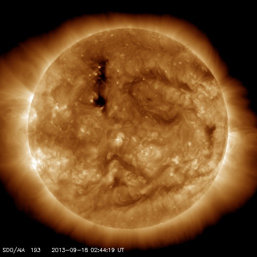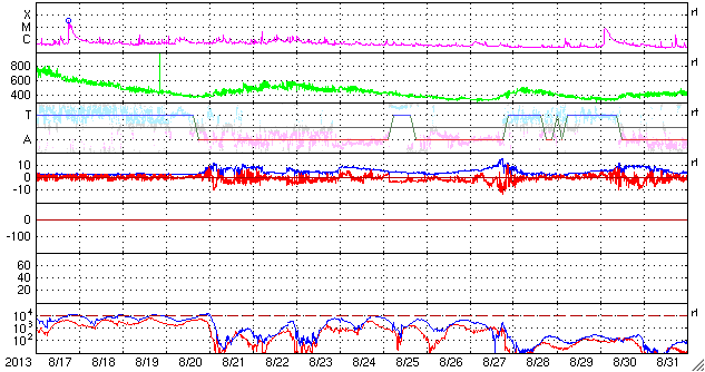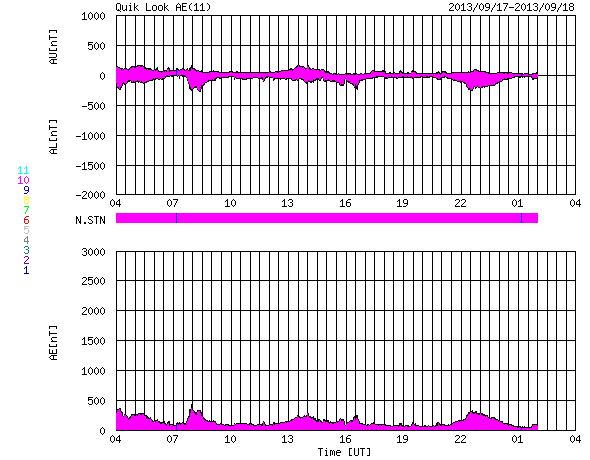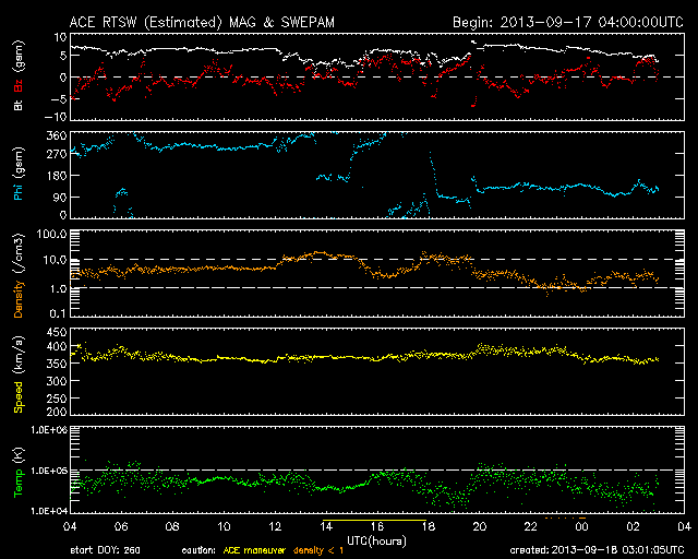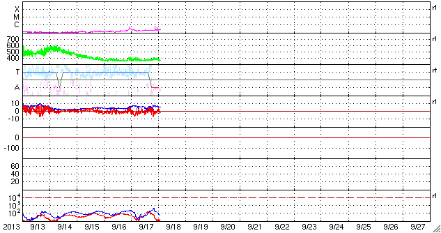 2013/ 9/18 12:01 更新 太陽風は低速です。太陽に黒点が増えています。ムルマンスクのオーロラをどうぞ。 担当 篠原 ロシア・ムルマンスクの福島さんより、 9月11日から15日にかけて、ムルマンスクの各地で撮影された オーロラの写真をいただきました。 それぞれ様々な場所で撮影されています。 写真の紹介に入っている地名を検索してみて下さい。 1枚目は、オーロラの輝きに山と森のシルエットが浮かび上がって、 とても美しい写真です。 2枚目は海に(?)、3、4枚目は湖にオーロラの輝きが映っていて、 オーロラの光に包まれているみたいです。 そして、3枚目はムルマンスクの町の中からオーロラを撮っています。 この町では普段こんな風景が見えているのですね。 人々の暮らしが見えるようで、こういう写真もいいですね。 とてもきれいな写真をありがとうございます。 いろんな場所でこんな美しい光景が展開されているのですね。 太陽風は、昨日のニュース以降速度が上がることはなく、 むしろ現在は350km/秒へ下がり気味です。 磁場強度は、7nT付近を上下しています。 昨夜のうちにセクターの境界が来たようで、 27日周期の図を見ると、「T」から「A」に切り替わっています。 前周期はそこから速度がゆっくりと上がっていったのですが、 今回はどうでしょうか。 明日にかけて引き続き注目して下さい。 磁気圏では、小規模の活動が時々発生しているようです。 AE指数は、200〜300nTの変化が数回起きています。 太陽は、東の端から一気に3つの黒点群が姿を現しました。 北半球に1847黒点群、南半球に1845、1846群です。 中央にも1843群が出現していて、 太陽の可視光写真はちょっとにぎやかになっています。 X線のグラフは、Bクラスの小さい変化が起きていますが、 東端の黒点群で起きています。 今後の変化に注目して下さい。