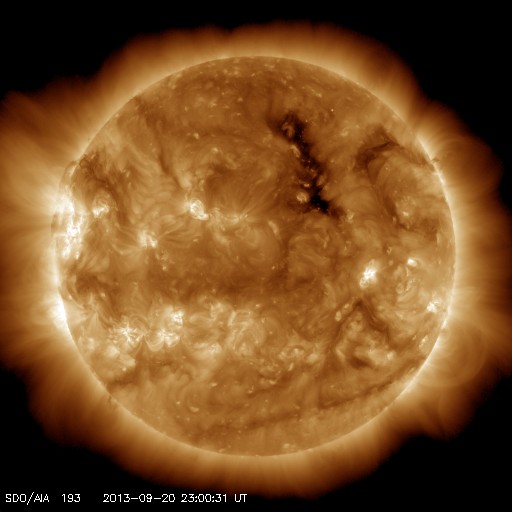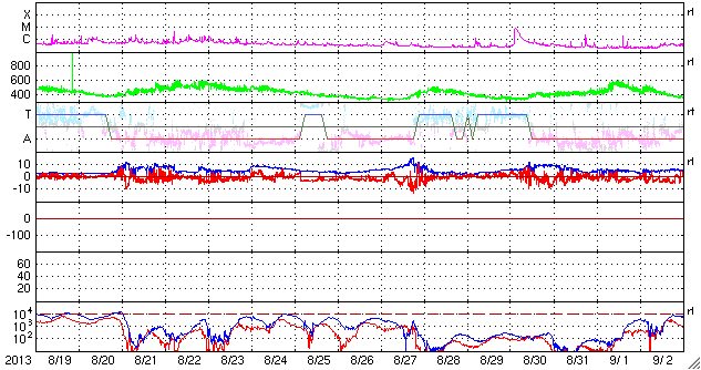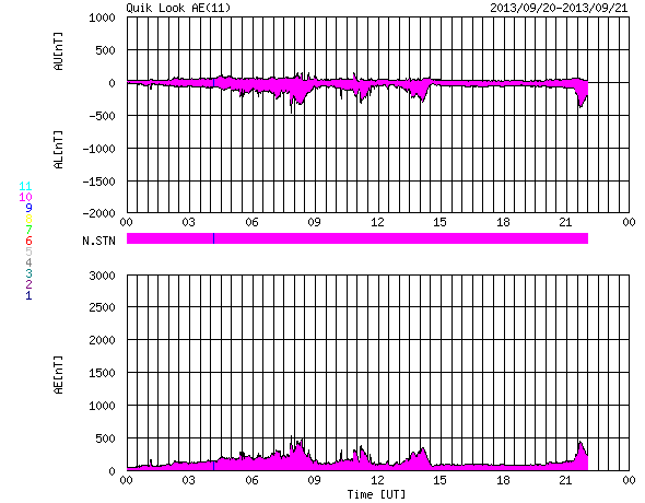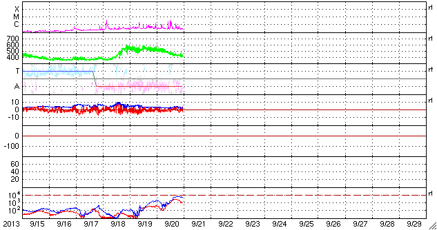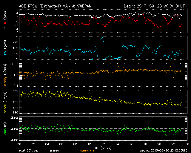 2013/ 9/21 08:16 更新 太陽風は平均的な速度に下がりました。Cクラスフレアが4回起きています。 担当 篠原 太陽風の速度は、昨日の午後、 20日16時(世界時20日7時)に500km/秒を割り、 その後もゆっくりと下がって、現在は420km/秒まで下がっています。 高速風の領域は通り過ぎた様です。 27日周期の図を見ると、高速風はおよそ2日続きました。 太陽風の磁場強度は、3nTとやや弱い値が続いています。 南北成分は、振れ幅は小さいですが南寄りの傾向です。 このため、磁気圏では小規模の活動が続き、 AE指数は、度々300〜400nTの変化が発生しています。 太陽風は穏やかな風に戻りましたが、 2〜3日後くらいに、SDO衛星AIA193の北側に見えている コロナホールの弱い影響がやって来るかもしれません。 太陽では、東端(左端)の1850黒点群の全体が見えるようになりました。 それほど大きい黒点ではありません。 この1850群で、C2.1、C3.8、C2.3、C1.3と、 Cクラスの小規模フレアが連続的に発生しています。 今後も同程度の活動が起きるかもしれません。 ![]() SDO衛星のAIA193カメラによる太陽コロナの様子 (c) SDO (NASA) ![]() SDO衛星による太陽の可視光写真。マウスの矢印を写真に重ねると、黒点番号付きの写真に切り替わります。 (c) SDO (NASA) ![]() ACEが観測した太陽風の磁場(1番上の枠、白線は全体の強度、赤線は南北成分) および、太陽風の密度(3番目の橙線)、速度(4番目の黄線) (c) NOAA/SWPC ![]() リアルタイムAE指数 下段のAEグラフの値が高くなると、オーロラ活動が活発化しています。 (c) 京都大学, NICT ![]() 27日の太陽周期に合わせたデータプロット 太陽が同じ面を地球に向けていた27日前の変化から、今後を予想することができます。 (c) 作図:宇宙天気ニュース