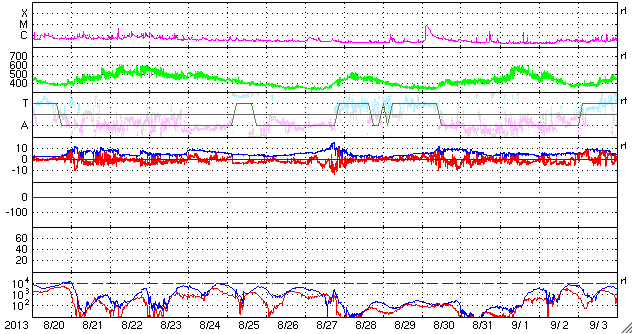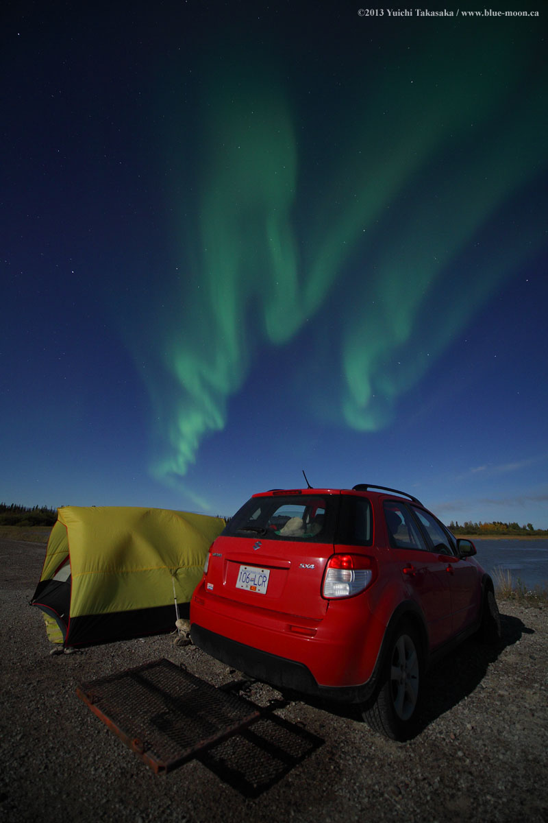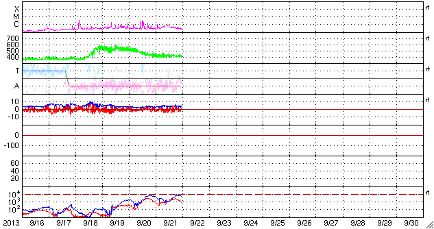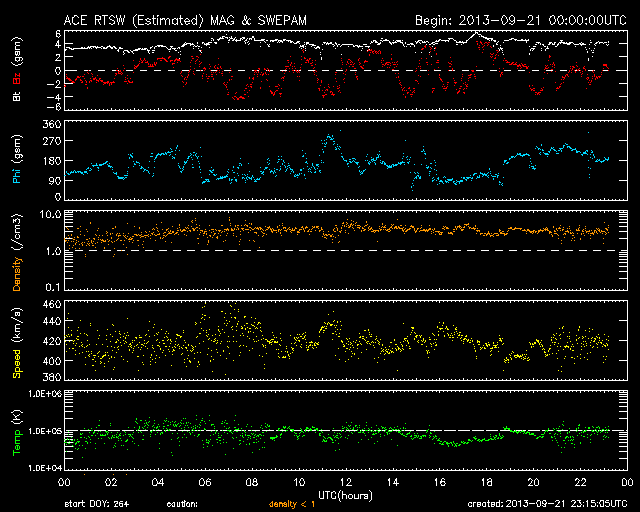2013/ 9/22 08:15 更新 太陽風は平均的な速さです。C3のフレアが発生しています。満月とオーロラの写真をどうぞ。 担当 篠原 カナダの高坂雄一さんより、 中秋の満月とオーロラが共演する素敵な写真が届きました。 画面いっぱいに広げてみていると、なんとも言えない良い気分になります。 高坂さんは、カナダ北部でオーロラ撮影の旅を続けているとのことですが、 この夜はそのままマッケンジー川の脇にテントを張って過ごしたそうです。 こんな旅行をしてみたいですね。 ずっと見ていたくなるような写真をどうもありがとうございます。 明日も続きの写真を紹介します。 太陽風は、420km/秒と平均的な速さで安定しています。 ACEの図では上下に変化していますが、変化の幅は小さく、 27日周期の図で速度を見ると、ほぼ一定です。 磁場強度は、3nTから4nTに少しだけ上がっています。 南北成分は、南と北によく振れています。 このため、磁気圏の活動はやや活発で、 AE指数は500nT程度の小規模の変化が度々発生しています。 今日の太陽風は、このまま穏やかに推移しそうです。 明日か明後日に、弱い速度の高まりがやって来るかもしれません。 太陽では、東端の1850黒点群で C3.0の小規模フレアが発生しています。 ![]() 高坂雄一さんによる、オーロラと中秋の満月の共演。 (c) 高坂雄一氏 ![]() オーロラを求めて、マッケンジー川の脇にテントを張る。 (c) 高坂雄一氏 ![]() SDO衛星のAIA193カメラによる太陽コロナの様子 (c) SDO (NASA) ![]() SDO衛星による太陽の可視光写真。マウスの矢印を写真に重ねると、黒点番号付きの写真に切り替わります。 (c) SDO (NASA) ![]() ACEが観測した太陽風の磁場(1番上の枠、白線は全体の強度、赤線は南北成分) および、太陽風の密度(3番目の橙線)、速度(4番目の黄線) (c) NOAA/SWPC ![]() リアルタイムAE指数 下段のAEグラフの値が高くなると、オーロラ活動が活発化しています。 (c) 京都大学, NICT ![]() 27日の太陽周期に合わせたデータプロット 太陽が同じ面を地球に向けていた27日前の変化から、今後を予想することができます。 (c) 作図:宇宙天気ニュース