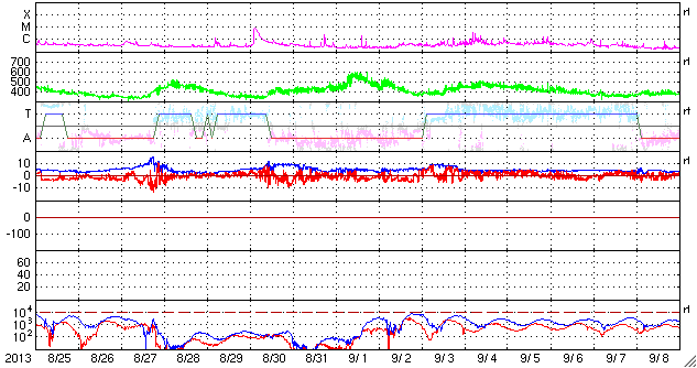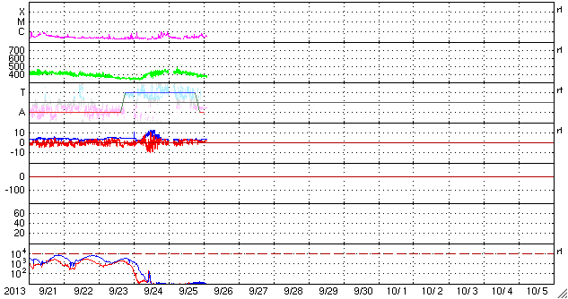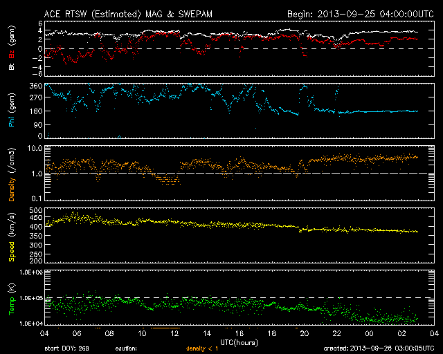 - 2013/ 9/25 08:45 太陽風の速度は430km/秒に少し高まりました。オーロラの活動も少し強まりました。