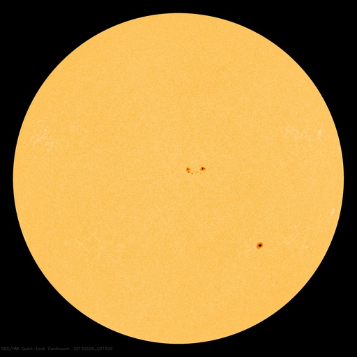 SDO衛星による太陽の可視光写真。マウスの矢印を写真に重ねると、黒点番号付きの写真に切り替わります。