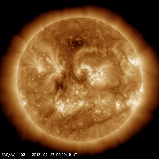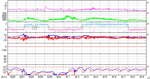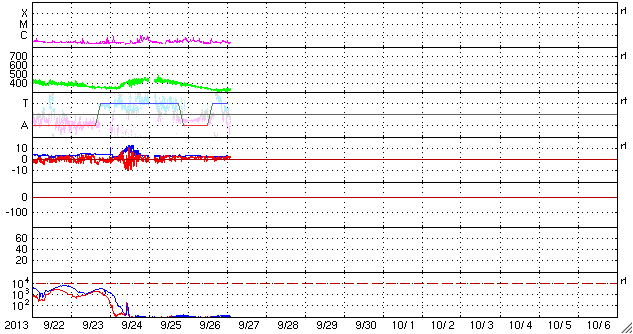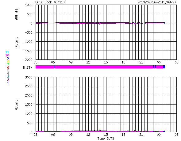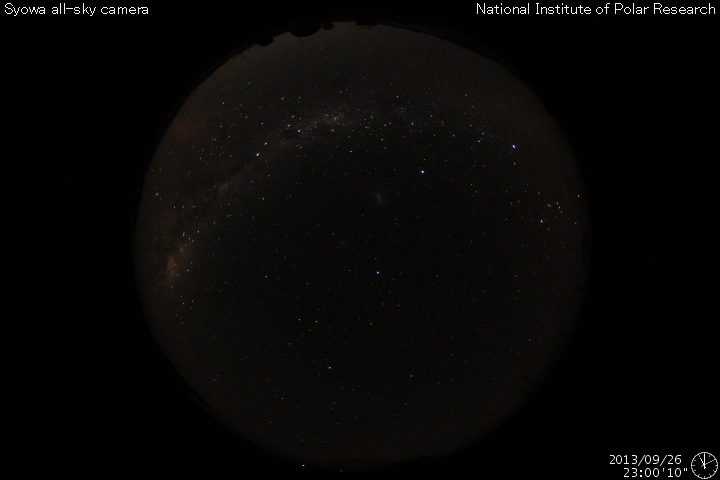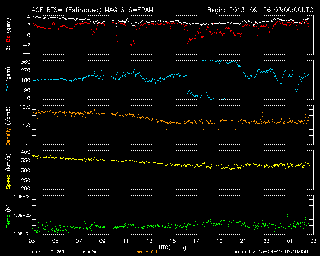 2013/ 9/27 11:41 更新 太陽風の速度は320km/秒に下がっています。太陽も静穏です。 担当 篠原 太陽風の速度は更に下がり、 320km/秒と一段と低速になっています。 磁場強度も、2〜3nTに弱まっています。 太陽風はとても穏やかです。 磁気圏の活動も静かで、AE指数は全く変化していません。 それでも、昭和基地の全天カメラを見ていると、 高緯度側の空の低い所にオーロラが現れたりしています。 その様子を動画で紹介します。 そのまま朝を迎えて、空が明るくなっていきます。 太陽の活動も静かです。 X線のグラフは、Bクラスの小さい変化が数回起きている程度です。 黒点も特に変化はなく、目立つものも西半球へ進んでいます。 STEREO Behind衛星によると、 東端の向こう側にも特に活動的な領域はなく、 太陽は、穏やかな状態がこのまま続くかもしれません。 ![]() 南極の昭和基地で、全天カメラにより撮影された世界時26日23時頃のオーロラ。 (c) 国立極地研究所、(動画加工 : 宇宙天気ニュース) ![]() SDO衛星のAIA193カメラによる太陽コロナの様子 (c) SDO (NASA) ![]() SDO衛星による太陽の可視光写真。マウスの矢印を写真に重ねると、黒点番号付きの写真に切り替わります。 (c) SDO (NASA) ![]() ACEが観測した太陽風の磁場(1番上の枠、白線は全体の強度、赤線は南北成分) および、太陽風の密度(3番目の橙線)、速度(4番目の黄線) (c) NOAA/SWPC ![]() リアルタイムAE指数 下段のAEグラフの値が高くなると、オーロラ活動が活発化しています。 (c) 京都大学, NICT ![]() 27日の太陽周期に合わせたデータプロット 太陽が同じ面を地球に向けていた27日前の変化から、今後を予想することができます。 (c) 作図:宇宙天気ニュース