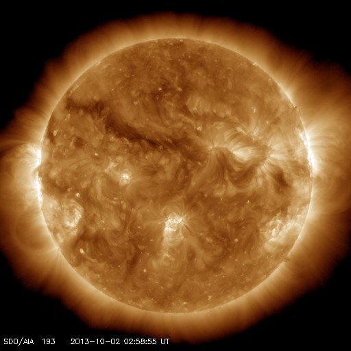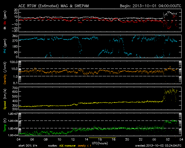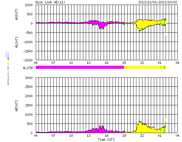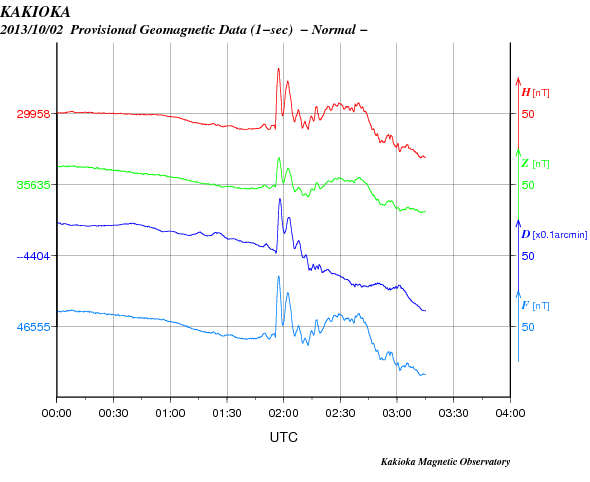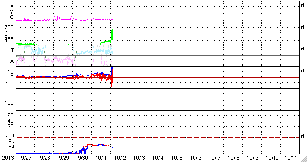 2013/10/ 2 12:24 更新 フィラメント噴出による太陽風の乱れが到来しました。磁気圏の活動も強まっています。 担当 篠原 予想よりもだいぶ早く、太陽風の乱れがやって来ました。 ACE衛星の観測によると、 今朝、2日10時半(世界時2日1時半)頃に変化が到来し、 太陽風の速度は600km/秒に、磁場強度は20nTに それぞれ大きく強まっています。 フィラメント噴出の発生が、 30日5時(世界時29日20時)頃だったので、 2日強くらいで地球までやって来たことになります。 かなり早い到来でした。 茨城県柿岡の気象庁地磁気観測所の磁場観測データでは、 2日11時(世界時2日2時)に変化が始まっています。 太陽風の変化に磁気圏が反応して、 磁場の強まりが各成分に発生しています。 ACEのデータを見ると、太陽風磁場の南北成分は、 擾乱到来の直後、大きく南向きに振れて-20nTに達しています。 その後、短時間で北に向かって反転していますが、 今後はどちら向きで推移するのでしょうか。 磁場が強く南を向いた影響で、 磁気圏の活動も大きく強まっています。 AE指数は1000nTを超える変動が発生しています。 (掲載の図では、まだその部分が見えていません) 今後も、太陽風磁場が再び南に大きく振れると、 磁気圏の活発な活動も続くことになるでしょう。 これからの時間帯であれば、 カナダやアラスカのライブカメラに注目して下さい。 太陽は、X線グラフに特に変化はなく穏やかです。 太陽放射線は、減少の傾向に変わり、 100を割って下がっています。 ![]() 茨城県柿岡の地磁気観測所で観測された、太陽風の擾乱による磁場の変化。 (c) 気象庁地磁気観測所 ![]() SDO衛星のAIA193カメラによる太陽コロナの様子 (c) SDO (NASA) ![]() SDO衛星による太陽の可視光写真。マウスの矢印を写真に重ねると、黒点番号付きの写真に切り替わります。 (c) SDO (NASA) ![]() ACEが観測した太陽風の磁場(1番上の枠、白線は全体の強度、赤線は南北成分) および、太陽風の密度(3番目の橙線)、速度(4番目の黄線) (c) NOAA/SWPC ![]() リアルタイムAE指数 下段のAEグラフの値が高くなると、オーロラ活動が活発化しています。 (c) 京都大学, NICT ![]() 27日の太陽周期に合わせたデータプロット 太陽が同じ面を地球に向けていた27日前の変化から、今後を予想することができます。 (c) 作図:宇宙天気ニュース