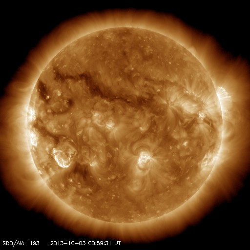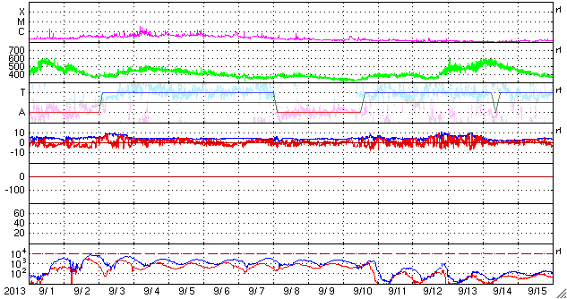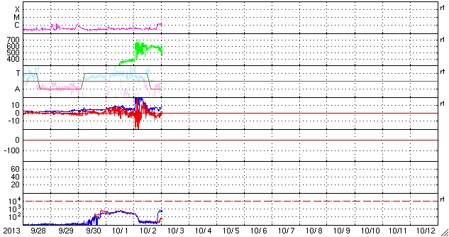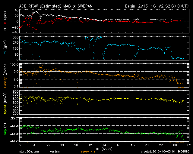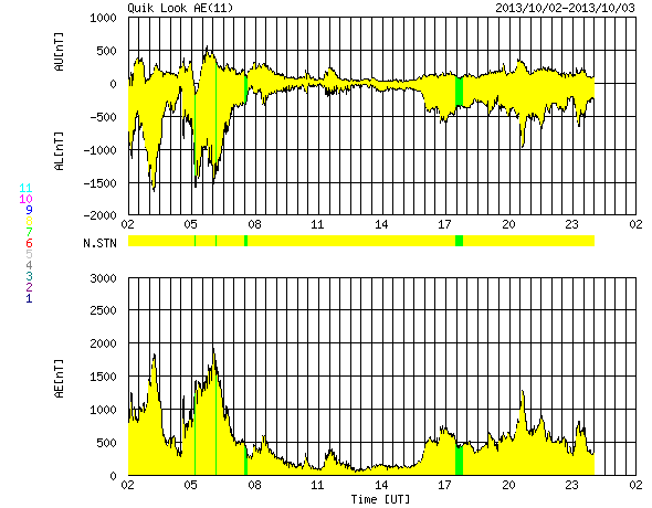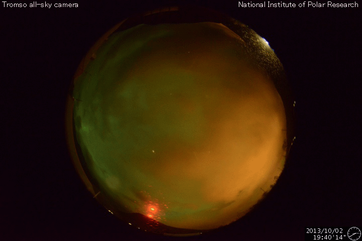 2013/10/ 3 10:19 更新 太陽風の乱れにより、磁気圏の活動が激しくなりました。フィンランドのオーロラをどうぞ。 担当 篠原 昨日の朝に到来した太陽風の乱れは現在も続いています。 太陽風の速度は、600km/秒に上がった状態が今朝まで続き、 現在、少し下がって500km/秒に近づいています。 磁場強度は、6時間にわたって20nTとかなり強い状態が続きました。 (一時的に30nTまで上がっています)。 その後、夜にかけて次第に下がり、 以降、7nTとやや強めの値で安定しています。 磁場の南北成分は、時間帯によって、南に振れたり北に振れたり、 いろいろと変わっています。 強度が高まっていたので、南に振れたときの振れ幅は大きくなり、 磁気圏への影響はかなり大きくなっていました。 AE指数を見ると、グラフの前半に、 1800nTとかなり激しい変動が2回発生しています。 中盤は、磁場が北寄りになって、磁気圏の活動も弱まり、 後半、磁場が再び南寄りに変わったため、 700nT前後の中規模の活動が続くようになっています。 このグラフの後半の活動に当たる、世界時2日20時頃のオーロラの写真を、 フィンランド中部オウルの小松兼一さんよりいただきました(現地23時頃)。 日本時間では今朝5時の撮影なので、撮ったばかりの最新オーロラ写真です。 小松さんによると、今回は湖畔の撮影で、無風だったため、 オーロラが湖面にきれいに反射していたそうです。 オーロラそのものは光が強いものではなかったものの、 上下ダブルのオーロラで、とてもまぶしく圧倒されたそうです。 オーロラはうっすらと長時間続き、 とてもワイドに空全体に広がっていたそうです。 そして、その薄いオーロラが強風でなびく様に、 あるいは、懐中電灯を振り回しているかの様に 凄い速さで光が動いていたそうです。 今回の太陽風擾乱による撮影直後の貴重なオーロラ写真と、 興味深いコメントをどうもありがとうございます。 同じタイミングのオーロラが、より緯度の高い場所にある、 ノルウェーのトロムソの全天カメラで撮影されていました。 撮影場所が異なれば、緯度や現地時間の違いによって、 オーロラの見え方も変わってきます。 2カ所のオーロラの様子を見比べて下さい。 太陽風の乱れは、これから次第に弱まっていくでしょう。 速度、磁場強度ともに下がっていき、 やがて、低速の穏やかな風に戻っていくと思います。 太陽は、南東の領域でC1の変化が発生している様です。 その他は特に変化はなく、穏やかな状態が続いています。 太陽放射線(非常に高速の陽子の流れ)は、 太陽風の乱れの到来後、一段と下がっています。