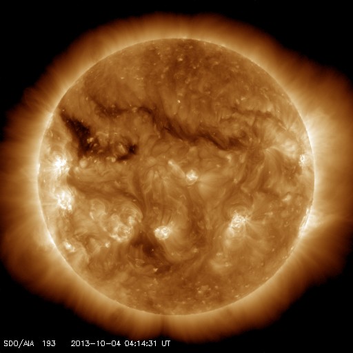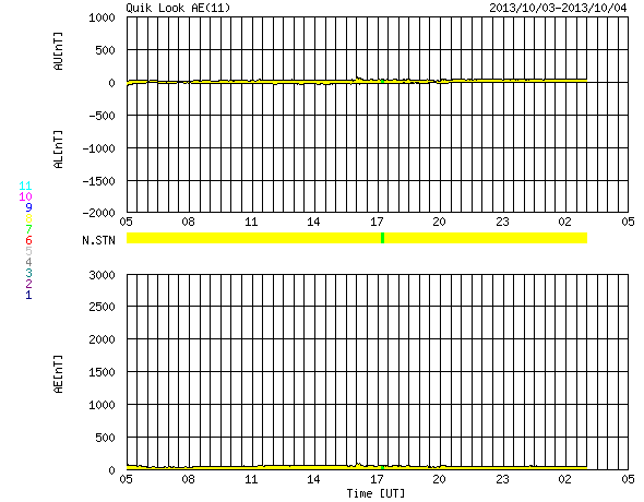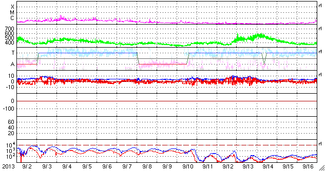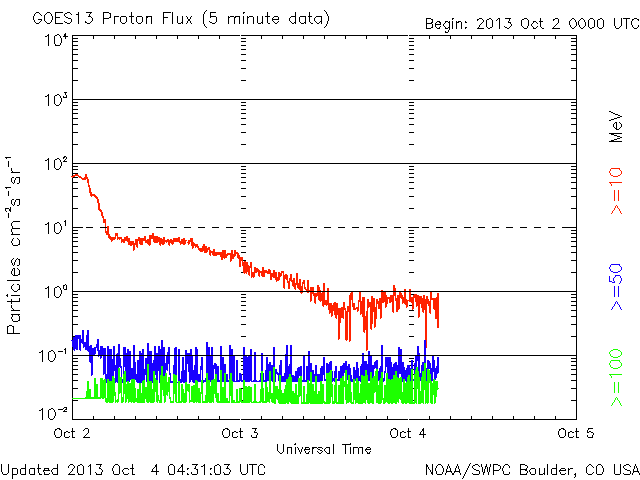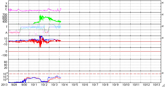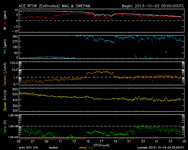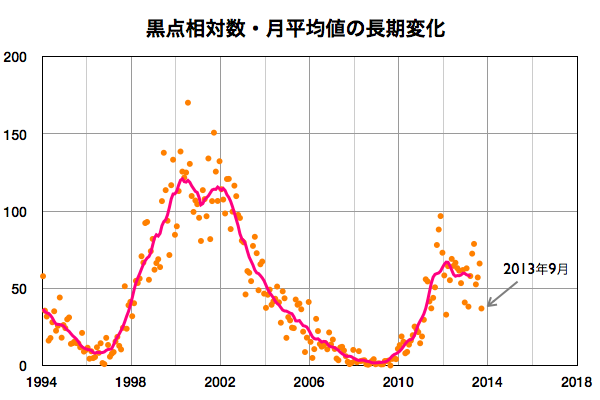 2013/10/ 4 13:31 更新 太陽風は平均的な風に戻り、磁気圏も静かです。9月の黒点数は36.9に下がっています。 担当 篠原 SIDCより、9月の黒点相対数は36.9と発表されました。 30台に下がったのは、2月の38.1以来で、7ヶ月ぶりです。 1994年以降の長期変化のグラフを掲載します。 9月の黒点数は、最近の平均値からは大きく下がっていますが、 これまでも、数ヶ月に一度くらいはこのレベルまで下がっていて、 特別に珍しい状態ではありません。 現在の太陽は、10月に入ったくらいから、 再び黒点が目立つ様になっています。 黒点数は10月も低いままなのか、前のレベルに回復するのか、 注目して下さい。 その太陽では、今朝から東側の黒点群で、 C1.8、C2.5とCクラスの小規模フレアが2回発生しています。 この後も、同程度の活動が続くかもしれません。 太陽風は、乱れの領域は通り過ぎ、 速度は400km/秒、磁場強度は4nTと どちらも平均的な状態に戻っています。 磁場の南北成分は、北向きの状態が続いています。 このため、磁気圏の活動は静かになり、 AE指数は全く変化していません。 太陽風は、穏やかな状態が続きそうです。 速度は、更に300km/秒台へ下がっていくかもしれません。
