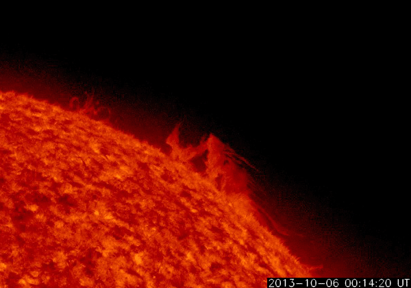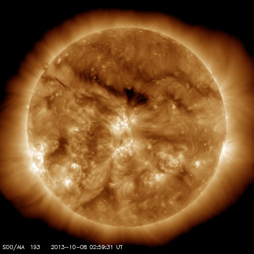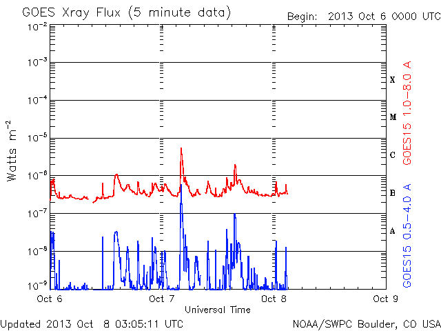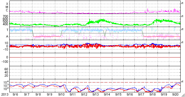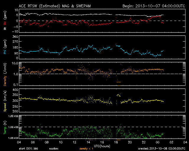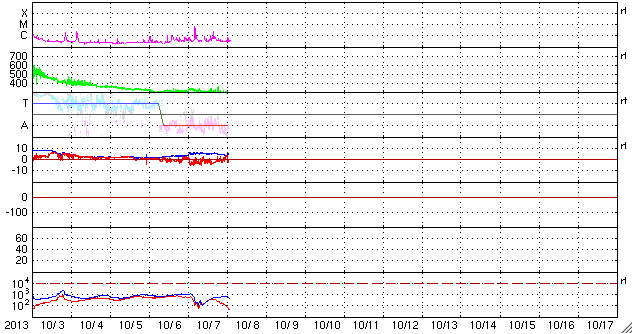 2013/10/ 8 12:06 更新 C6.2の小規模フレアが発生しました。太陽風は300km/秒の低速風です。 担当 篠原 太陽の北西の端で見られた2日間ほどのプロミネンスの変化を、 SDO衛星AIA304の動画で紹介します。 ゆらゆらとコロナのガスが動き、 やがて高く噴き上がって行く様子がきれいです。 この様な太陽のゆっくりとした変動もSDO衛星のみどころです。 昨日の昼、7日13時(世界時7日4時)に、 太陽の中央の1856黒点群でC6.2の小規模フレアが発生しました。 9月中は太陽が穏やかだったため、 この規模のフレアの発生は8月30日のC8.3以来で、 およそ40日ぶりです。 1856群は、その後にC2.3のフレアも起こしています。 黒点の様子も少し変化していて、 現在の様な活動が続くかもしれません。 太陽では、昨日から黒点群の番号が3つ増え、 更に、新しい黒点も現れています。 少しにぎわってきています。 太陽風は、再び速度が下がって、 300km/秒とかなり遅い風に戻っています。 磁場強度は5nTで安定していますが、 南北成分は、南寄りから北寄りに変わりそうです。 磁気圏では、小規模の活動が起きていた様で、 AE指数は200〜300nTくらいの変化が続いています。 このまま太陽風の磁場が北寄りになると、 磁気圏の変化も終わってしまうでしょう。 北半球のコロナホールは、太陽の中心線を通過して、 西側に少しせり出しています。 2日後くらいから、 この領域の影響で太陽風の速度が高まるかもしれません。 27日周期の図の9月13〜14日に見られた高速風の回帰です。