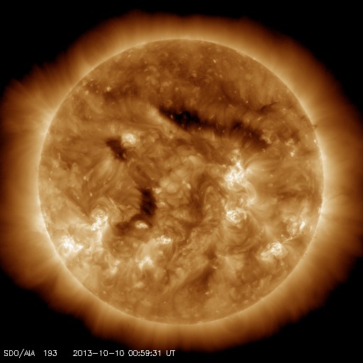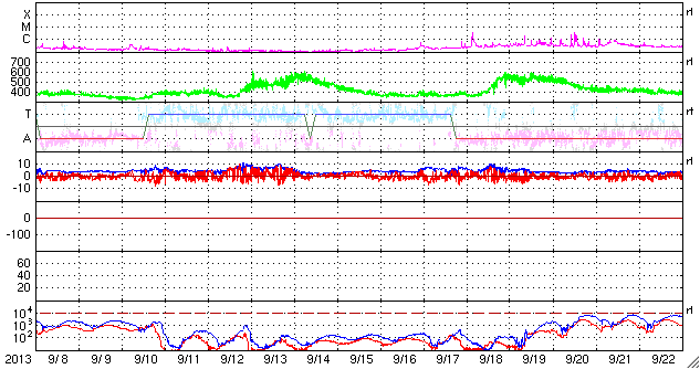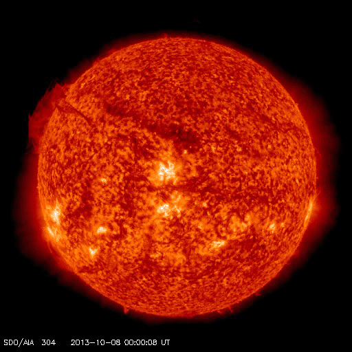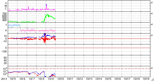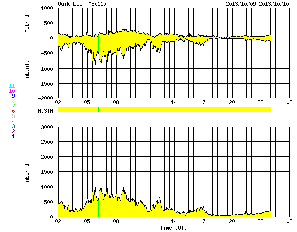 2013/10/10 10:18 更新 太陽風の速度は470km/秒に下がり、太陽風の乱れは終わりつつあります。 担当 篠原 太陽風の速度は、昨日のニュースの頃を最高に、 その後は低下が続いています。 現在は470km/秒と既に500km/秒台を割り、 高速風は終わりつつあります。 一方、太陽風の磁場強度はまだ高まったままで、 現在も10nTと高い値が続いています。 南北成分は、0nTを挟んで南北に小幅の変化をしています。 磁気圏の活動も次第に規模が下がっていて、 AE指数のグラフの前半は1000nTと大きく変化していますが、 後半は静かになっています。 太陽風の乱れは、今日いっぱいくらいで落ち着きそうです。 太陽では、昨日のM2.8以降は目立ったフレアはなく、 落ち着いています。 黒点は、南東(左下)の1865黒点群の磁場構造が複雑になっていて、 フレアの発生に注意が必要です。 昨日お知らせできなかったのですが、 8日から9日にかけて、 太陽の北東側で大規模なフィラメントの噴出が発生しました。 その様子をSDO衛星AIA304の動画で紹介します。 初めに東端のフィラメントが噴き上がり、 続いて、右隣のフィラメントが噴き出します。 変化が繋がっていく様子など、興味深いです。 この噴出によってCMEも発生しています。 後半の噴出の影響が地球にも到来するかもしれません。