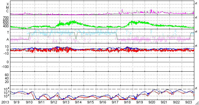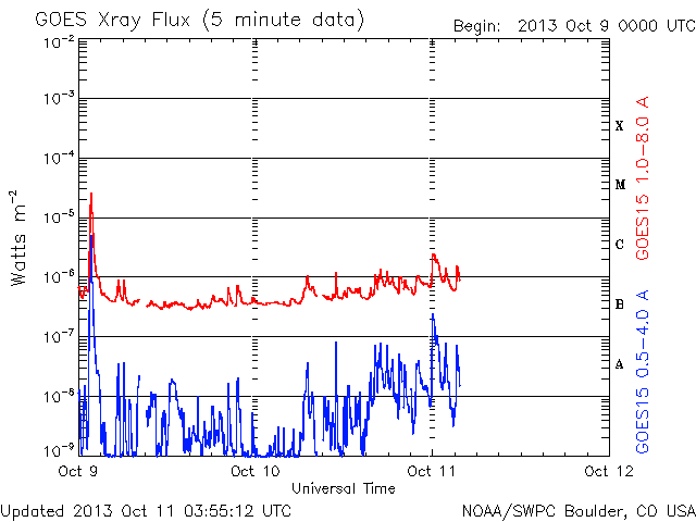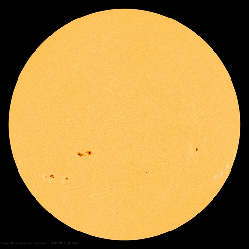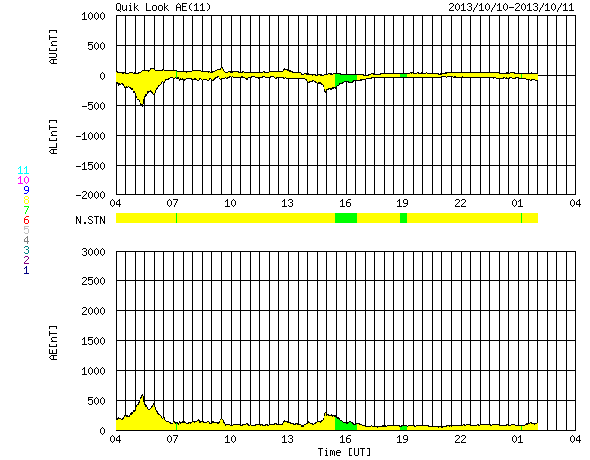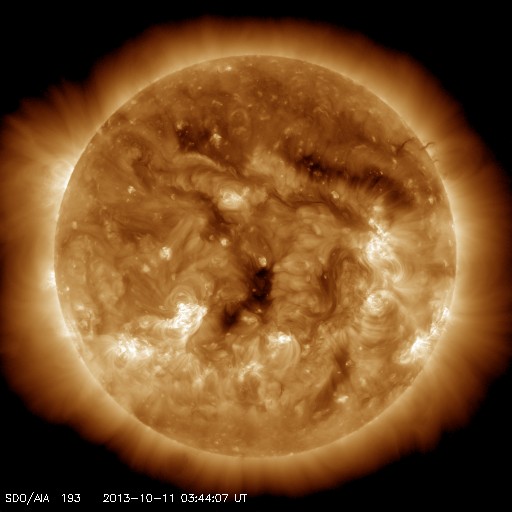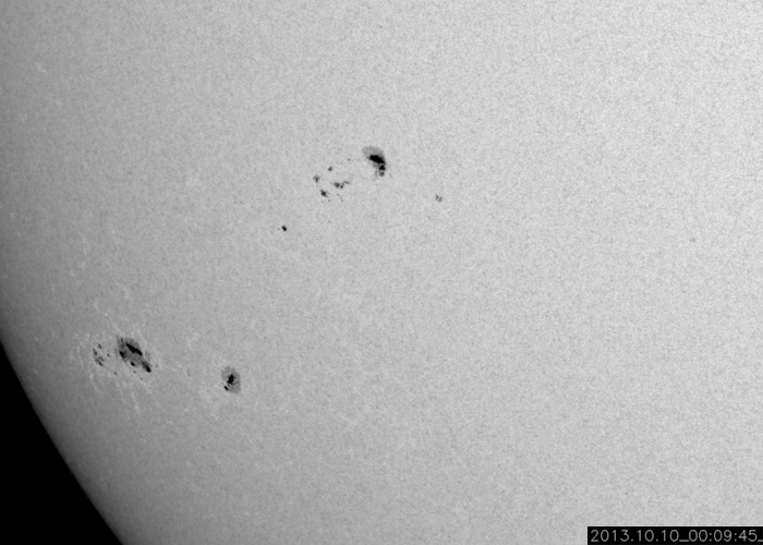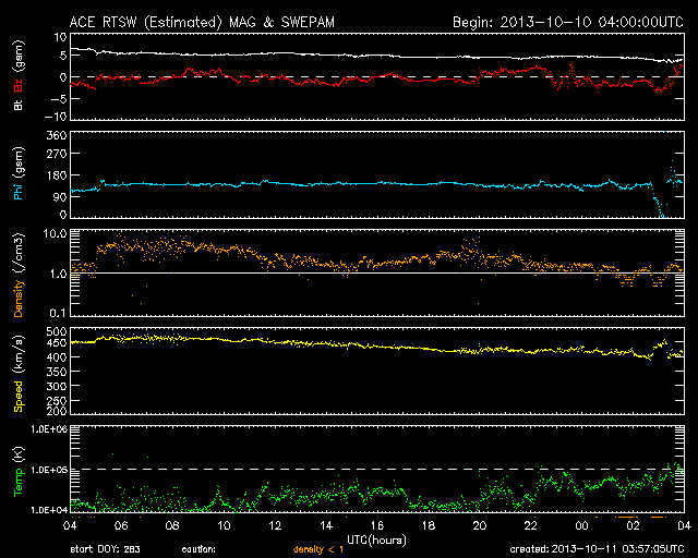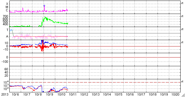 2013/10/11 12:57 更新 1861黒点群が大きくなっています。太陽風は平均的な状態です。 担当 篠原 太陽の南東部にあった1861黒点群が、大きく変化しています。 昨日から今日にかけての様子を、 SDO衛星可視光写真の動画で紹介します。 小さい黒点が連なって現れたり、それらが捻るように動いて行ったり、 細かい変化がよく見えています。 動画の左下に見えるのは、1864群と1865群です。 1865群は磁場構造の複雑さが高まっていて、 フレアの発生に注意が必要です。 X線グラフは、全体の強度が次第に上がり、 小さい変化も頻繁に起きています。 C1〜3のフレアが、1861群と1865群で発生していて、 これから更に大きいフレアが起きるかもしれません。 太陽風は、速度がゆっくりと下がって、 今朝くらいに400km/秒と平均的な値に戻りました。 磁場強度も4nTに下がり、磁場の強まりも終わっています。 磁気圏も概ね静穏で、 AE指数は500nTと250nTの変化が2回起きていますが、他は静かです。 SDO衛星AIA193を見ると、北半球のコロナホールは 太陽の西側に動いています。 一昨日の太陽風の乱れのために、変化が分かりにくくなっていますが、 これ以上、特に影響は見られないのでしょうか。 ![]() SDO衛星の可視光写真による、1861黒点群の発達の様子。 (c) SDO (NASA)、 (動画加工 : 宇宙天気ニュース) ![]() SDO衛星のAIA193カメラによる太陽コロナの様子 (c) SDO (NASA) ![]() SDO衛星による太陽の可視光写真。マウスの矢印を写真に重ねると、黒点番号付きの写真に切り替わります。 (c) SDO (NASA) ![]() GOES衛星の太陽X線データ (c) NOAA/SWPC ![]() ACEが観測した太陽風の磁場(1番上の枠、白線は全体の強度、赤線は南北成分) および、太陽風の密度(3番目の橙線)、速度(4番目の黄線) (c) NOAA/SWPC ![]() リアルタイムAE指数 下段のAEグラフの値が高くなると、オーロラ活動が活発化しています。 (c) 京都大学, NICT ![]() 27日の太陽周期に合わせたデータプロット 太陽が同じ面を地球に向けていた27日前の変化から、今後を予想することができます。 (c) 作図:宇宙天気ニュース