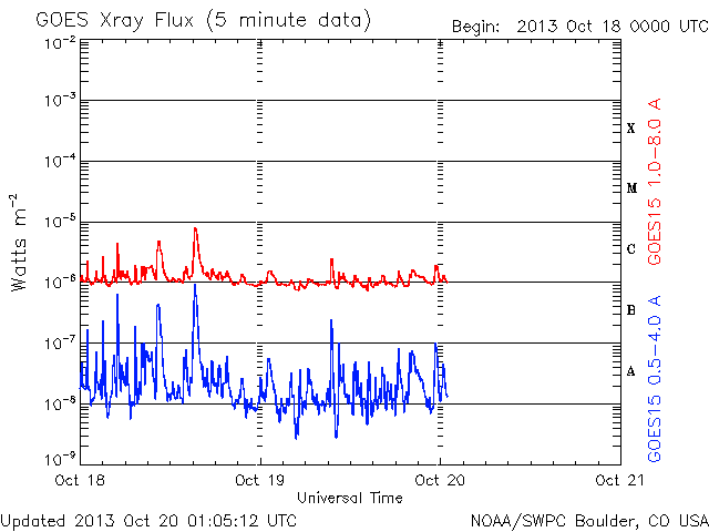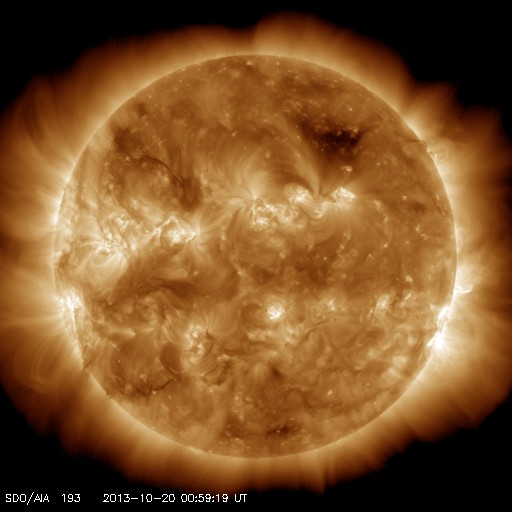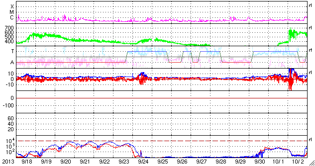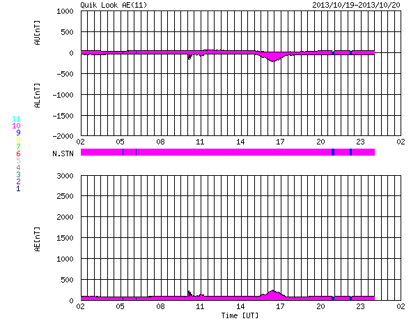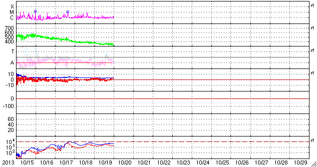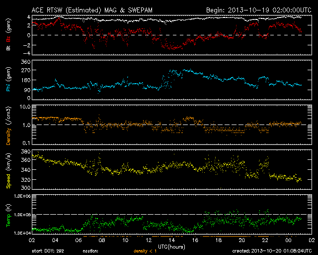 2013/10/20 10:08 更新 太陽のフレア活動はやや落ち着いています。太陽風は低速です。 担当 篠原 太陽のフレアの発生は、現在は比較的静かになっています。 昨日の夕方以降に、西の端の1861黒点群で C1〜3程度のフレアが4回ほど発生しましたが、 黒点群が没してしまったので、活動は見えなくなりました。 一方、東側には、1875黒点群と、 新しく現れた1877黒点群が大きな姿を見せています。 X線の動画では、チカチカと小さい輝きが発生していて、 活動の規模が拡大する様だと注意が必要になるでしょう。 太陽風は、更に速度が下がり、 現在は320km/秒とだいぶ遅い風になっています。 27日周期の図の前周期(9月22〜23日頃)も、 速度は300km/秒くらいに下がって、 その後速度の小さい高まりが来ています。 今回もこれから同様の変化をたどるのかもしれません。 SDO衛星AIA193で見える北半球側のコロナホールは、 緯度が高いため地球へは影響が及びにくいのですが、 西側(右側)に進んで、 タイミングとしては良いくらいになっています。 磁気圏の活動は静穏で、AE指数はほとんど変化していません。