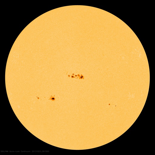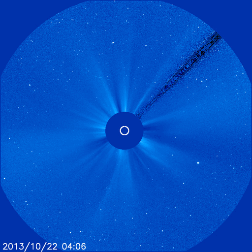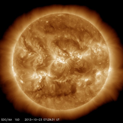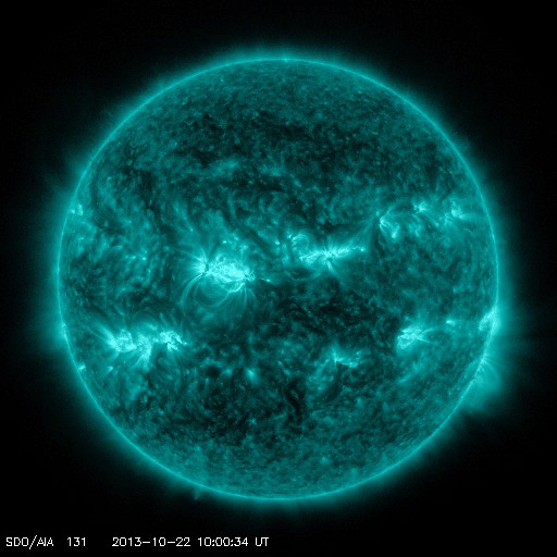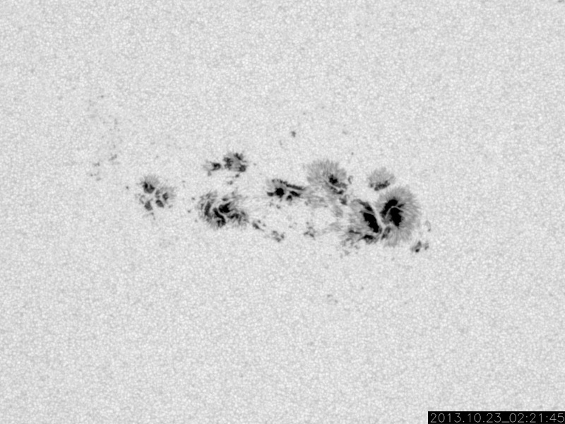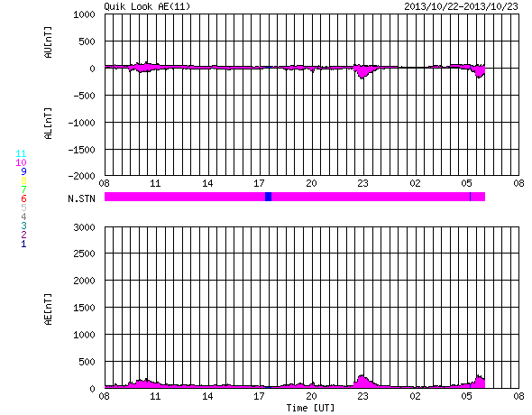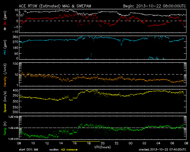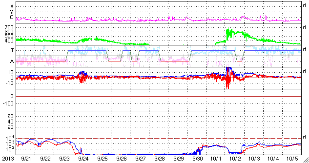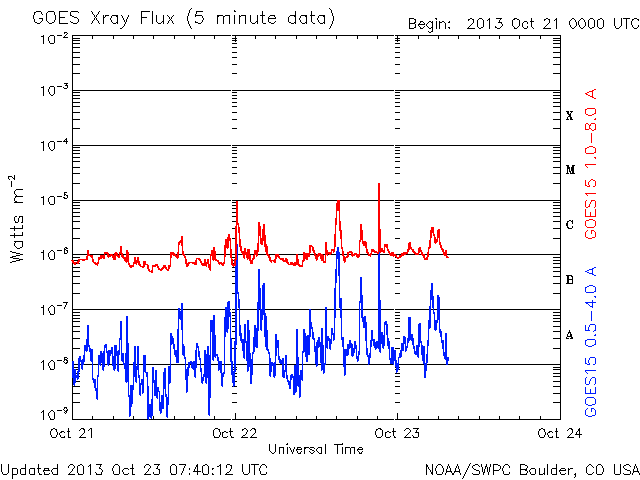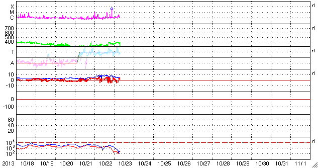 2013/10/23 16:39 更新 Mクラスのフレアが2回発生しました。太陽風はやや低速です。 担当 篠原 1875黒点群の活動が続いています。 23日0時(世界時22日15時)にM1.0、 23日6時(世界時22日21時)にはM4.2と、 2つの中規模フレアを起こし、 C1〜4のフレアを昨日のニュース以降7回起こしています。 活発な活動の様子を、SDO衛星AIA131の動画で紹介します。 動画の途中で、2つのMクラスフレアも起きています。 また、可視光による1875黒点群の拡大写真を掲載します。 黒点は複雑な姿を保っていて、 引き続きMクラスのフレアなどに注意が必要です。 昨日のフィラメント噴出によるCMEの様子を、 SOHO衛星LASCO C3カメラの動画で紹介します。 CMEのガスは主に北向きに噴き出していて、 地球への影響は小さくなりそうです。 太陽風は、速度が少し上がって、 370km/秒とやや低速の風になっています。 反対に、強まっていた磁場強度は下がって、 現在は5nTと平均的な値に戻っています。 27日周期の図で前周期と比べると、太陽風の変化は弱まっています。 磁気圏は静穏です。 AE指数のグラフはほとんど変化していません。 今日は学校の事情で更新が夕方になってしまいました。 すみません。 鹿児島は台風の影響が始まったのか、風がだいぶ強まっています。