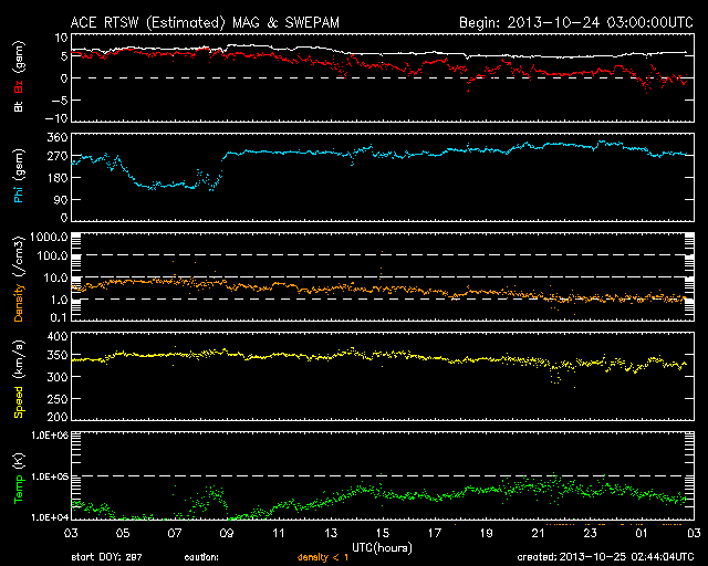 - 2013/10/21 11:43 太陽はCクラスのフレアが数回発生しています。太陽風はかなり低速です。