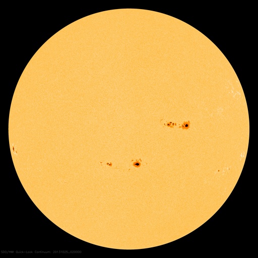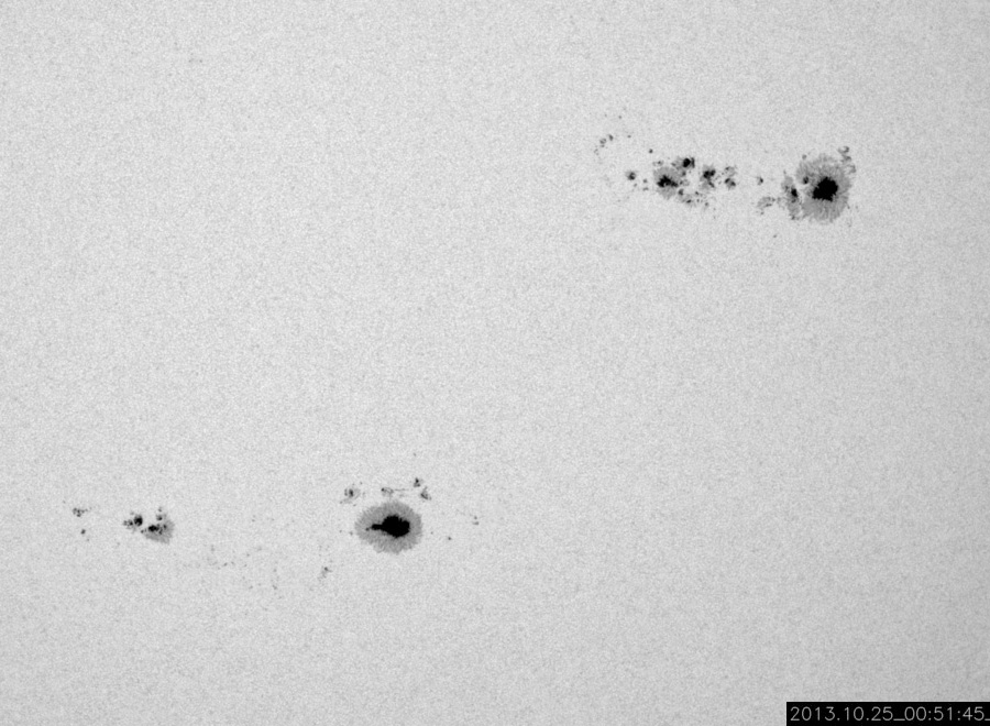 SDOの可視光写真による、1875黒点群(右)と1877黒点群(中央)と1879黒点群(左)。