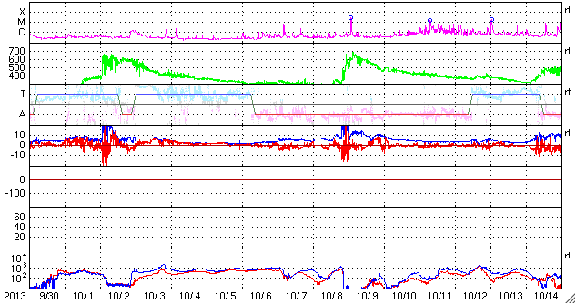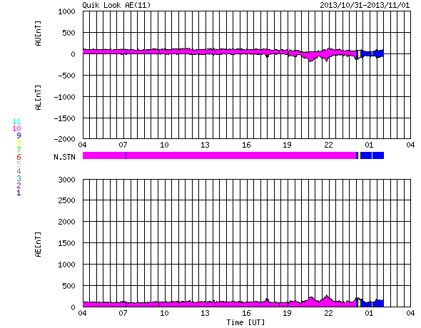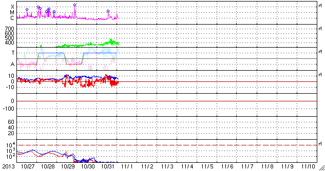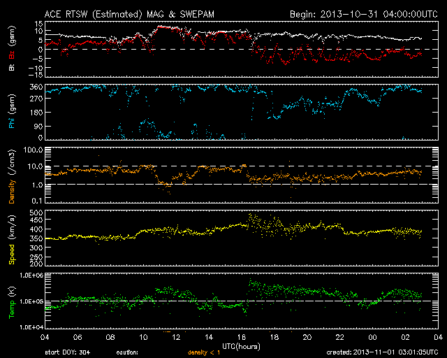 2013/11/ 1 12:02 更新 ニュージーランドのオーロラ写真をご覧ください。M1.9のフレアが発生しています。 担当 篠原 ニュージーランド、クィーンズタウンの米戸 実さんより、 10月30〜31日の夜に撮影された、 赤いオーロラの見事な写真が届きました。 昨日のニュースでお知らせした、 太陽風の磁場が強まって、南向きに振れ続けていた頃の写真です。 米戸さんによると、太陽の活動が続いていたため、 太陽風の乱れが到来するのを手ぐすね引いて待っていたそうです。 残念ながら強い乱れは到来しませんでしたが、 赤い色の見事なオーロラを撮影することができたそうです。 ニュージーランドは緯度が低いため、 独特の雰囲気のオーロラを見ることができますね。 今回もどうもありがとうございました。 太陽風は、速度がもう少し上がって、 400km/秒と平均的は速さになっています。 反対に、磁場強度は下がり気味の様で、 10nT近くに強まっていたのが、現在は5nTと平均的な値です。 磁場の南北成分は、ACEの図の前半は北向き、 後半は南向きになっています。 しかし、磁気圏の活動は小さく、 AE指数の図の後半に小さい変化が見えている程度です。 太陽では、西に沈んだ1877黒点群でM1.9の中規模フレアと、 中央付近の1884黒点群でC6.2の小規模フレア、 その他にC1のフレアが5回ほど発生しています。 明日から水曜日まで高知に出張します。 しばらく更新が不定期になります。 ご了解下さい。 ![]() ニュージーランド南島クィーンズタウンで、現地時間10月30日22時半に撮影されたオーロラ。 (c) 米戸 実氏 ![]() ニュージーランド南島クィーンズタウンで、現地時間10月31日4時に撮影されたオーロラ。 (c) 米戸 実氏 ![]() SDO衛星のAIA193カメラによる太陽コロナの様子 (c) SDO (NASA) ![]() SDO衛星による太陽の可視光写真。マウスの矢印を写真に重ねると、黒点番号付きの写真に切り替わります。 (c) SDO (NASA) ![]() ACEが観測した太陽風の磁場(1番上の枠、白線は全体の強度、赤線は南北成分) および、太陽風の密度(3番目の橙線)、速度(4番目の黄線) (c) NOAA/SWPC ![]() リアルタイムAE指数 下段のAEグラフの値が高くなると、オーロラ活動が活発化しています。 (c) 京都大学, NICT ![]() 27日の太陽周期に合わせたデータプロット 太陽が同じ面を地球に向けていた27日前の変化から、今後を予想することができます。 (c) 作図:宇宙天気ニュース
