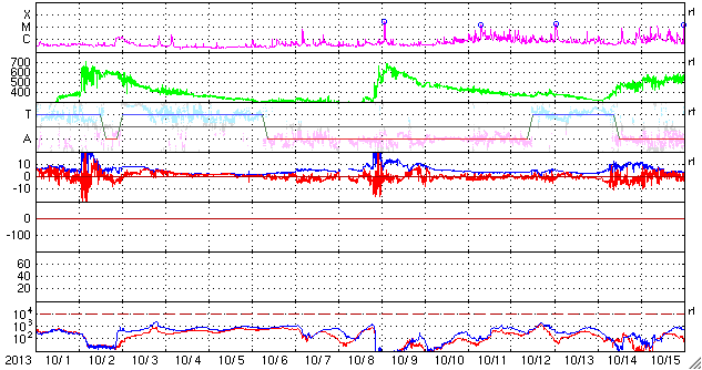 (c) 福島留美氏、トロフィノワ・リューバ氏 ![]() 10月30日にムルマンスクにやって来たソチオリンピックの聖火リレー。 (c) 福島留美氏、オストラヤ・ヴィオレッタ氏 ![]() GOES衛星のX線カメラによる、太陽中央部のM6.3フレアの様子。 (c) NOAA/SWPC 、(動画加工 : 宇宙天気ニュース) ![]() SDO衛星のAIA193カメラによる太陽コロナの様子 (c) SDO (NASA) ![]() SDO衛星による太陽の可視光写真。マウスの矢印を写真に重ねると、黒点番号付きの写真に切り替わります。 (c) SDO (NASA) ![]() ACEが観測した太陽風の磁場(1番上の枠、白線は全体の強度、赤線は南北成分) および、太陽風の密度(3番目の橙線)、速度(4番目の黄線) (c) NOAA/SWPC ![]() リアルタイムAE指数 下段のAEグラフの値が高くなると、オーロラ活動が活発化しています。 (c) 京都大学, NICT ![]() 27日の太陽周期に合わせたデータプロット 太陽が同じ面を地球に向けていた27日前の変化から、今後を予想することができます。 (c) 作図:宇宙天気ニュース