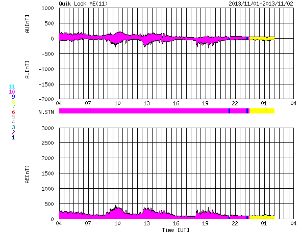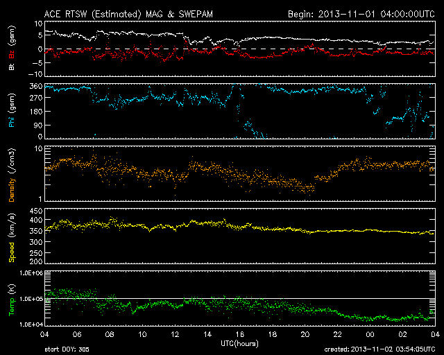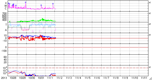 2013/11/ 2 12:54 更新 M6.3の中規模フレアが発生しました。ムルマンスクのオーロラをどうぞ。 担当 篠原 ロシア・ムルマンスクの福島さんより、 10月31日未明に撮影されたオーロラの写真をいただきました。 ムルマンスク市の北のロデイノエ町で、 トロフィノワ・リューバさんという女性の方の撮影だそうです。 広角写真らしく白い雪原が広々と広がっていて、 白み始めた空とたくさんの星々の輝き、 それらをまたぐように広がる緑や赤のオーロラと、 とてもきれいな光に包まれた感じのする写真です。 このオーロラは、昨日紹介したニュージーランドの写真と 同じ太陽風磁場の乱れによって強められたオーロラです。 降雪シーズンの中の束の間に見ることができた貴重な一枚とのことです。 また、2枚目は宇宙天気の写真ではありませんが、 2014年に行われるソチオリンピックの聖火リレーが、 10月30日にムルマンスクにやって来たそうです。 まさに同じ夜に、オーロラの下の町で こんな楽しそうな催しが行われていた様です。 素敵な写真をどうもありがとうざいます。 現在の太陽風は、速度が350km/秒に下がって、 低速風に戻っています。 磁場強度も5nTから3nTに下がり、やや弱まっています。 太陽風はとても穏やかです。 太陽風磁場の南北成分は、振れ幅は小さいですが、 南寄りに振れています。 このため、磁気圏では小さい活動が続いていて、 AE指数は300nTくらいの変化が数回起きています。 太陽のフレア活動の影響は特に見られることもなく、 太陽風や磁気圏はこのまま静かに経過するのかもしれません。 太陽では、今朝、2日5時(世界時1日20時)に、 中心付近の1884黒点群でM6.3の中規模フレアが発生しました。 1884群は、昨日のニュース以降も C1〜3の小規模フレアを5回ほど起こしていて、 その後に大きなフレアの発生となった様です 引き続きこの群の活動に注目してください。 今日は学会に参加するため高知に来ています。 高知駅で更新をしていますが、 今日は曇り空でやや寒そうな感じです。