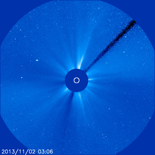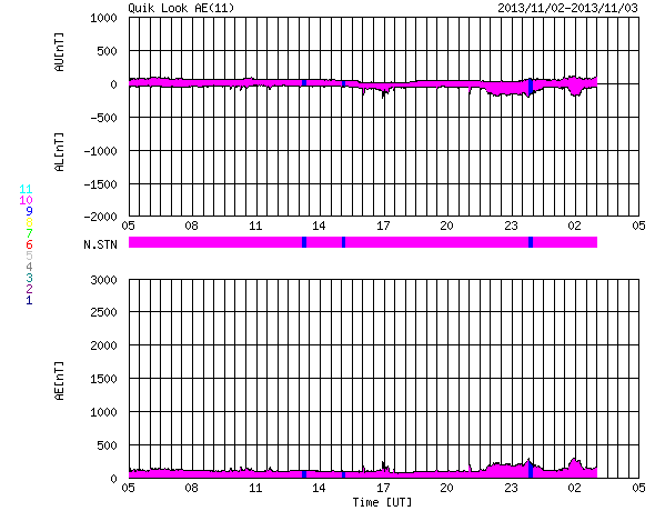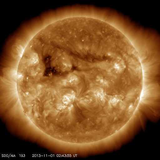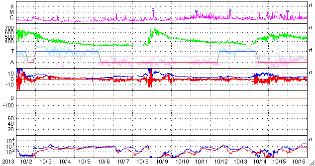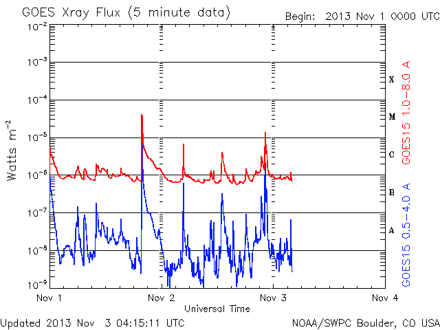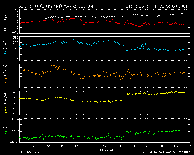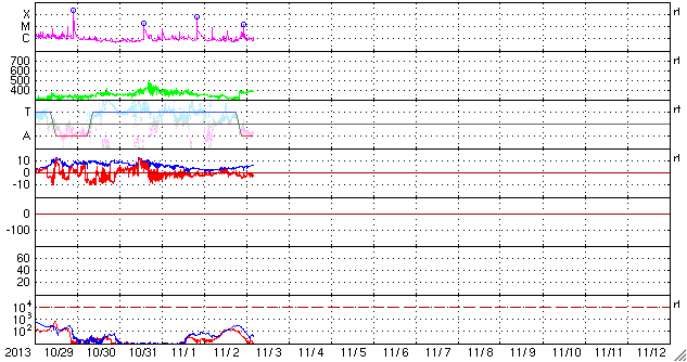 2013/11/ 3 13:17 更新 1884黒点群のフレア活動は続いています。フィンランドのオーロラ写真をどうぞ。 担当 篠原 10月30〜31日の夜に発生した活発なオーロラの写真の3地点めとして、 フィンランド中部のオウルの小松兼一さんから届いた4枚の写真を紹介します。 太陽活動の強まりによるオーロラの強まりを、 小松さんも期待して待っていたそうです。 残念ながら、あまり光が強いものは来なかったそうですが、 空一面に現れるオーロラを、午前3時頃まで眺めることができたとのことです。 両端の地平線から真上を横切って伸びるオーロラの大きな帯が、 動かずに長い間残っていて、 オーロラの真下で包まれていた様な感じがしたそうです。 この感覚は、現地に行かないと分からないものですね。 激しい活動ではなかったのかもしれませんが、 素晴らしいオーロラの様子を伝えて下さって、ありがとうございます。 太陽風は、穏やかな風が続いています。 今朝、3日5時(世界時2日20時)に、 速度が330km/秒から380km/秒に急に高まる変化が来ています。 太陽活動による太陽風の小規模の乱れが到来した様です。 磁場強度は、3nTから5nTに少し上がった程度で、 平均的な状態です。 南北成分はやや南寄りになっている程度で、 磁気圏は概ね静穏です。 AE指数には200nTくらいの小さい変化が見えています。 太陽では、裏側に回った黒点群が活発な活動を続けている様です。 SOHO衛星LASCO C3カメラで、 太陽の裏側で発生した激しいCMEが撮影されています。 1つめのCMEは、裏側の中心付近で発生した様で、 太陽全体に広がるように白いガスが噴き出しています。 これが太陽のこちら側の現象だったら、地球直撃コースです。 そして、2つめのCMEは太陽から右上に向かっています。 こちらも裏側の現象です。 太陽のこちら側では、1884黒点群で 昨日、2日13時半(世界時2日4時半)に、C8.2と大きいCクラスフレアが、 今朝、3日7時(世界時2日22時)にM1.6の中規模フレアが発生しています。 1884黒点群は、この他にもC1〜4のフレアを4回ほど起こしていて活発です。 更に、太陽の東端から1890黒点群という、 かなり大きい黒点が姿を現しました。 1884群とともに、可視光の拡大写真を掲載します。 こちらの活動度はこれから見ていく必要があります。