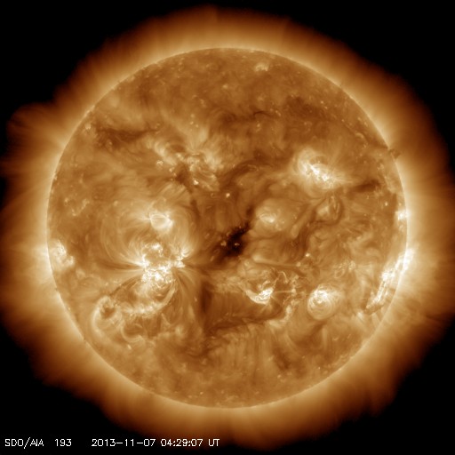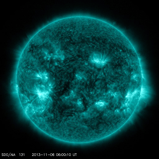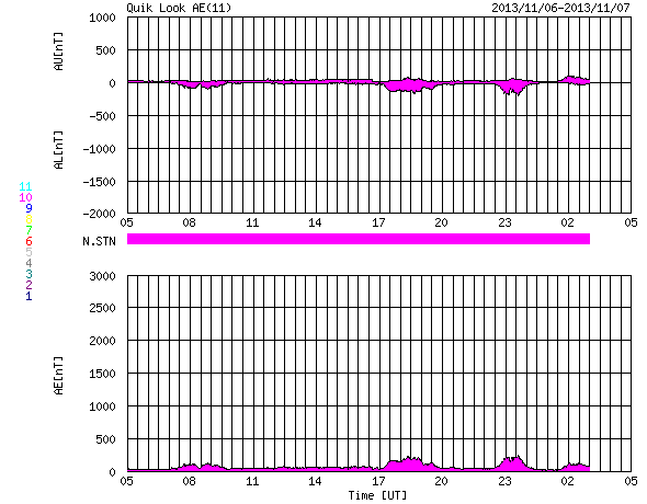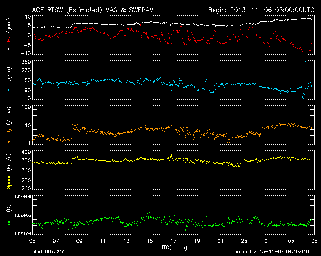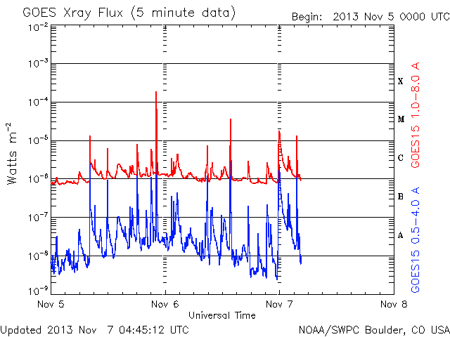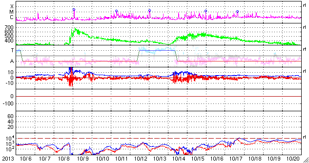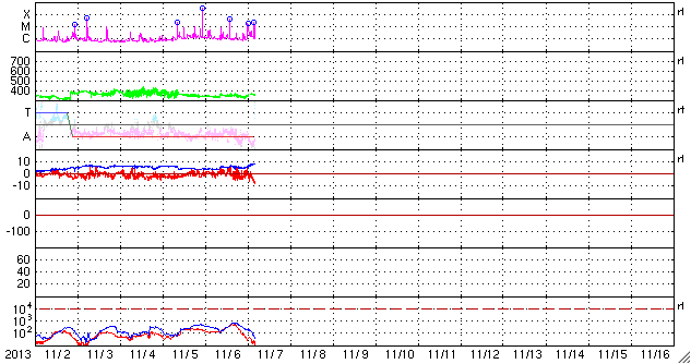 2013/11/ 7 13:49 更新 太陽のフレア活動は続いていて、Mクラスフレアが3回発生しています。 担当 篠原 太陽のフレア活動は続いています。 昨日のXフレア以降も、1890黒点群は活発に活動していて、 C4.7、C8.6、M3.8、M2.3などのフレアを起こしています。 その様子を、SDO衛星AIA131と304の動画で掲載します。 動画の後半では、西の端でM1.8の中規模フレアも起きています。 これは一昨日くらいに見えなくなった1882黒点群かもしれません。 1890黒点群は、依然、大きく複雑な姿を保っています。 引き続き中規模フレアや大きい小規模フレア発生の可能性がある様です。 太陽風は、昨日のニュース以降も350km/秒で速度は安定し、 低速の風が続いています。 磁場強度は、昨日の4nTから増加傾向にあって、 現在は8nTとやや強まっています。 磁場の南北成分は、今日のACEの図の後半から南寄りに振れる様になり、 現在は-8nTに強まっています。 このため、これから磁気圏の活動がある程度高まるかもしれません。 現在までのAE指数は、 200nTくらいの小さい変化が数回起きている程度です。 SDO衛星AIA131では、 太陽の中心に規模は小さいですがコロナホールが見えています。 27日前の前周期の変化を参照すると、 3日後の10日くらいに太陽風速度の高まりが回帰してくるかもしれません。 このところ太陽のフレア活動にばかり目が行っていましたが、 コロナホールによる周期的な変化にも注意が必要です。 昨夜、鹿児島に帰ってきました。 天気の関係もあるのかもしれませんが、 鹿児島に戻ってくると、こちらの方が暖かいなと思いました。