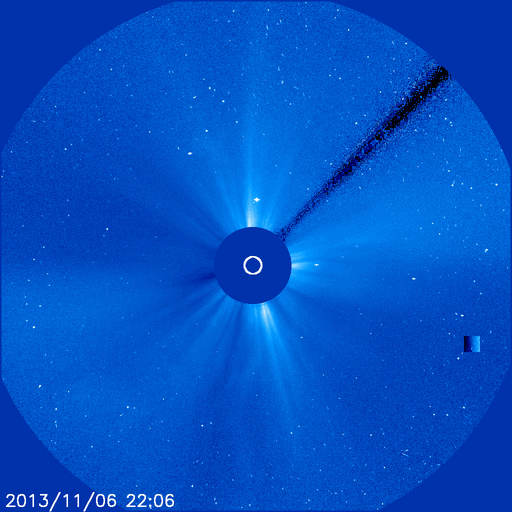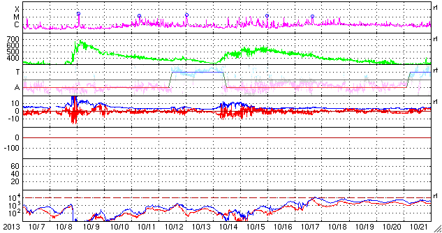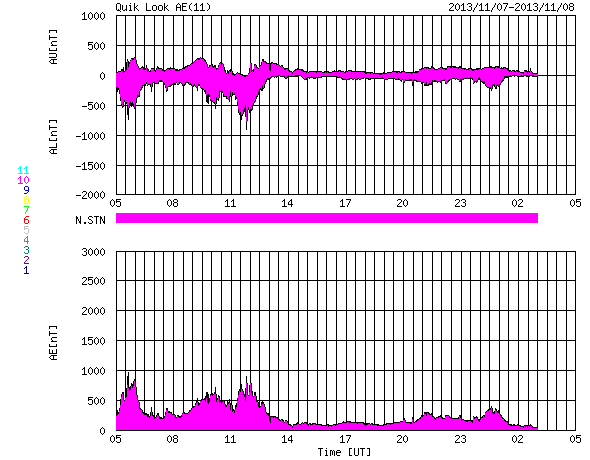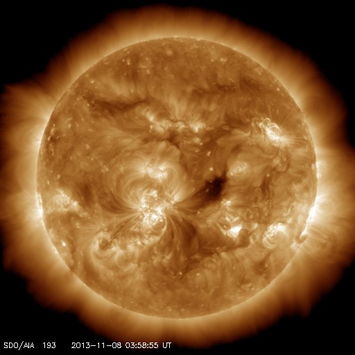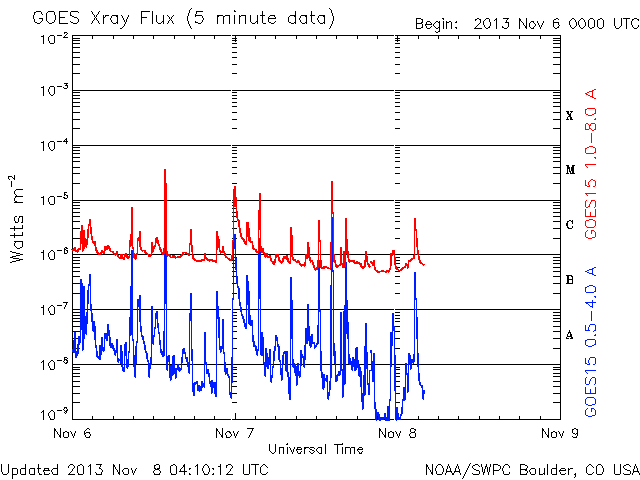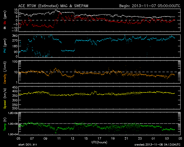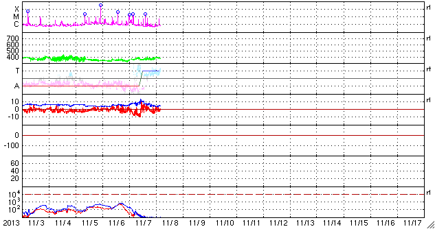2013/11/ 8 13:12 更新 太陽では小中規模のフレアが続いています。シベリア上空のオーロラをどうぞ。 担当 篠原 11月1〜3日のニュースで、 10月30日から31日にかけて世界各地で撮影された オーロラの写真を紹介しましたが、 新たに、喜田研一さんより、 シベリア上空で現地時間10月31日4時に撮影された オーロラの写真が届きました。 羽田からパリへ飛ぶ飛行機の中から撮影したそうで、 写真の下には飛行機の翼も写っています。 窓ガラス越しの撮影で、 カメラを固定するのも難しかったと思いますが、 見事なオーロラが写っています。 これだけ写っていると、 かなり明るいオーロラだったのではないでしょうか。 窓の外にこのようなオーロラの輝きが広がっていると、 移動の長い時間も楽しく感じられることでしょう。 すばらしい写真をありがとうございます。 太陽では、フレアの発生が続いています。 昨日のニュース以降も、1890黒点群では、 C5.9、M2.4、C6.0などのやや大きいフレアと、 C1〜2のフレアが5回ほど起き、 1891黒点群でも、C4.3、C5.7のフレアが起きています。 1890群は大きな姿を保ち、1891群は急に目立ってきた黒点群です。 今後も大きいフレアの発生に注意が必要です。 太陽は、裏側でも活発に活動しているようです。 SOHO衛星LASCO C3カメラでは、 昨日の朝に西端で発生したフレアによるCME(右方向への噴出)に続いて、 太陽の裏側のフレアによる、 太陽の左半分を包む様に広がるCMEも撮影されています。 太陽は、この後も注目を続けて下さい。 太陽風は、低速ですが速度が少し高まって、 350〜400km/秒の間でゆっくりと変化しています。 磁場強度は、昨日、10nT近くに高まりましたが、 今日になると下がり、現在は5nTと平均的な状態です。 太陽風磁場の南北成分は、昨日のニュース以降、 -5〜-10nTの南向きの状態が数時間続き、 AE指数は800nTくらいの中規模の変動を記録しています。 極域ではにぎやかなオーロラが見られたのではないでしょうか。 現在の太陽風磁場は、強度が下がるとともに、 南北成分は0nT付近に弱まり、磁気圏もやや静かになっています。