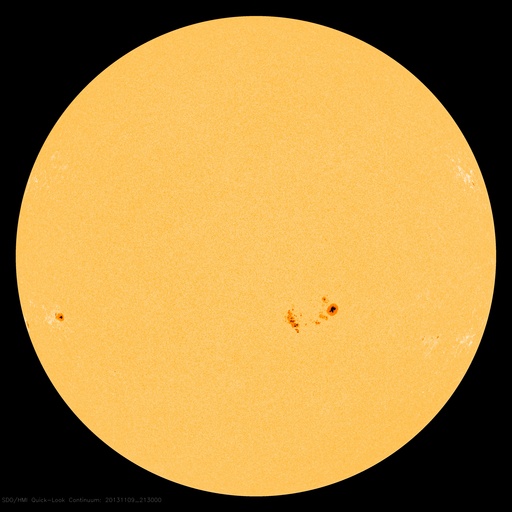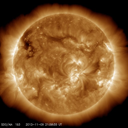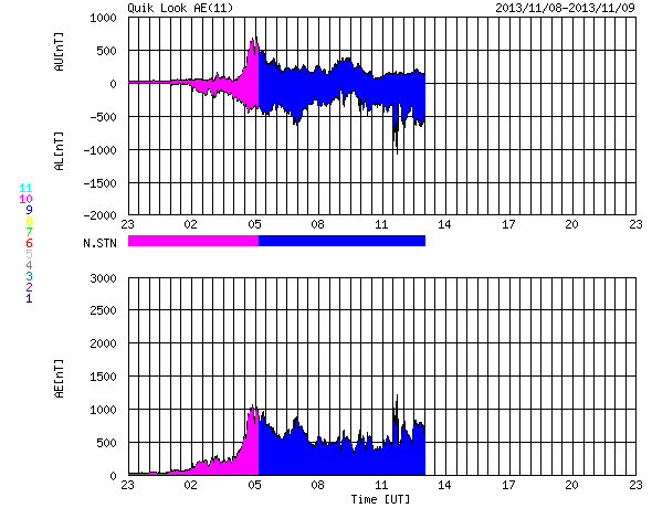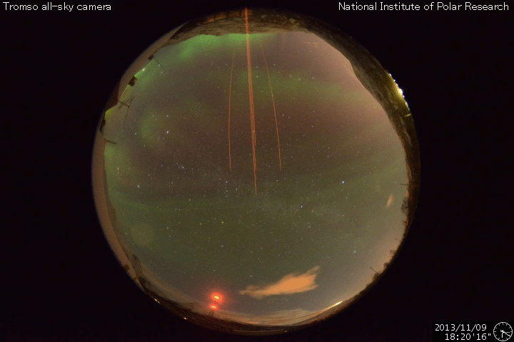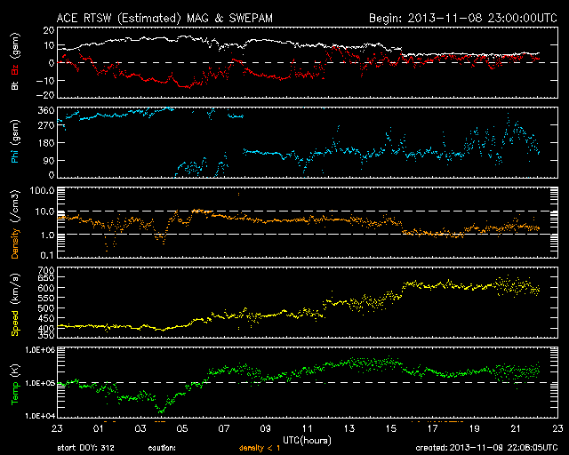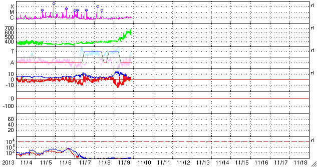 2013/11/10 07:08 更新 太陽風は600km/秒の高速風になっています。磁気圏の活動も高まりました。 担当 篠原 昨日の午後、9日14時(世界時9日5時)頃から、 400km/秒だった太陽風の速度はゆっくりと上昇を始め、 深夜、10日1時(世界時9日16時)頃に600km/秒に達し、 以降6時間ほどその状態が続いています。 27日周期の図を見ると、 高速太陽風は前周期よりも1日ほど早く到来し、 最高速度は前周期よりも少し高まっています。 また、15nT近くに強まっていた太陽風の磁場強度は、 速度が上がり始めるとともに弱まっていき、 600km/秒に達した頃には5nTと平均的な値にまで下がって、 その後は安定しています。 従って、高速風は既に最高速度に達している様です。 太陽風磁場の南北成分は、 昨日のニュース以降、更に南向きに強まりました。 最高で-15nTの強い南向きになっています。 このため、磁気圏の活動も高まり、 AE指数は500〜1000nTの間で活発な変化をしています。 AE指数は途中でデータがストップしていますが、 太陽風磁場の南北成分は、この頃から北寄りに変わっています。 従って、磁気圏活動もこの頃から 規模が小さくなっている可能性があります。 その時間帯に入っていますが、 ノルウェー・トロムソの全天カメラの様子を紹介します。 オーロラの帯が、空を左右に伸びて輝いています。 前周期の高速風は、4日ほど続きました。 今回もその程度が目安になるかもしれません。 太陽は、活動が弱まっています。 フレアの記録としては、C1〜2の小さいフレアが12回と、 数は多いのですが、規模は小さくなり、 X線グラフの変化も迫力がなくなっています。 一連の活動も、このあたりで一段落となるのでしょうか。 ![]() ノルウェー・トロムソの全天カメラで撮影されたオーロラ。 (c) 国立極地研究所、(動画加工 : 宇宙天気ニュース) ![]() SDO衛星のAIA193カメラによる太陽コロナの様子 (c) SDO (NASA) ![]() SDO衛星による太陽の可視光写真。マウスの矢印を写真に重ねると、黒点番号付きの写真に切り替わります。 (c) SDO (NASA) ![]() ACEが観測した太陽風の磁場(1番上の枠、白線は全体の強度、赤線は南北成分) および、太陽風の密度(3番目の橙線)、速度(4番目の黄線) (c) NOAA/SWPC ![]() リアルタイムAE指数 下段のAEグラフの値が高くなると、オーロラ活動が活発化しています。 (c) 京都大学, NICT ![]() 27日の太陽周期に合わせたデータプロット 太陽が同じ面を地球に向けていた27日前の変化から、今後を予想することができます。 (c) 作図:宇宙天気ニュース
