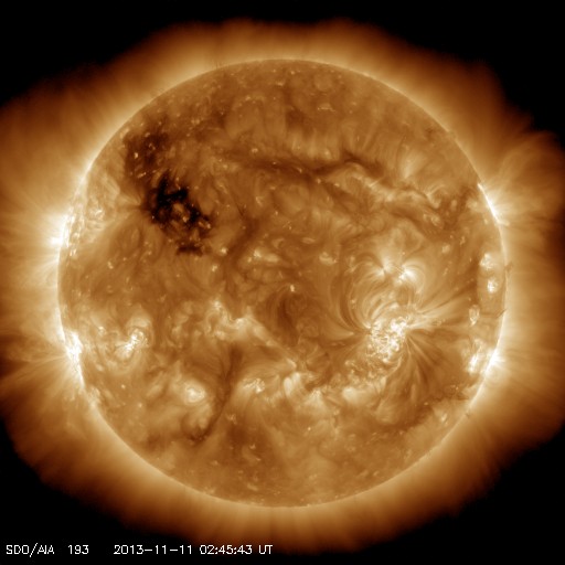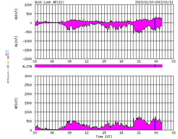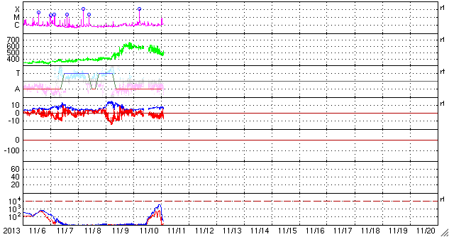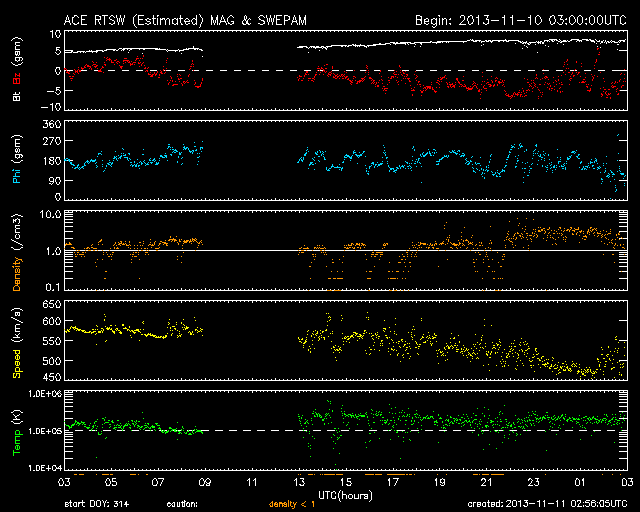 2013/11/11 11:56 更新 X1.1の大規模フレアが発生しました。タスマニア島のオーロラをどうぞ。 担当 篠原 カナダの高坂雄一さんより、 今回は南半球、オーストラリアの南のタスマニア島から オーロラの写真が届きました。 オーロラを英語でノーザンライツといいますが、 こちらは南極なのでサザンライツです。 このオーロラは、タスマニア南東部タスマン国立公園の、 車で行ける最南端 Maingon Bay Lookout で、 現地時間9日22時9分に撮影されたそうです。 昨日のニュースで紹介した、 太陽風磁場が強く南に振れていた頃のオーロラです。 現地は天候が良くないらしく、 この日は、奇跡的に数時間晴れてくたため、 活発になったオーロラを見ることができたそうです。 2枚目は、同じ場所で撮影された夕暮れの写真です。 やがて、日が暮れてオーロラが姿を現したのでしょうか。 海の彼方に見えるオーロラというのはなんだか素敵ですね。 高さによる色の違いもよく分かります。 貴重な写真をどうもありがとうございます。 高坂さんは、引き続きサザンライツハンティングとのことです。 好天と太陽風擾乱の到来をお祈りしています。 その太陽では、昨日、Xクラスの大規模フレアが発生しました。 10日14時(世界時10日5時)に1890黒点群で起きた、X1.1のフレアです。 フレアの様子をSDO衛星AIA131と193の動画で紹介します。 太陽の中央少し右下で、明るい爆発が発生しています。 AIA193(茶色)の動画では、爆発に伴って、 ガスの噴出もある程度起きている様に見えます。 SOHO衛星のLASCOカメラでも小規模の噴出は起きている様で、 地球へ太陽風の乱れをもたらすでしょうか。 到来するのは、明日から明後日にかけてくらいでしょう。 1890黒点群は、今朝、11日9時半(世界時11日0時半)にC6.4、C7.8と、 大きめのCクラスフレアを続けて起こしています。 引き続き注目して下さい。 また、太陽の東端からは、1895、1896黒点群が姿を現しています。 これらの黒点群の活動にも注目して下さい。 太陽風は、高速風の速度が次第に下がっています。 現在は、500km/秒を割るくらいになっていて、 高速風は終わりが近づいているのかもしれません。 磁場強度は、5nTから7nTへ少しだけ上がっています。 南北成分が再び南寄りに変わっていて、磁気圏の活動度を高めています。 AE指数のグラフは、図の中盤以降、 300〜600nTくらいの活動が連続的に起きています。 極域ではオーロラがにぎやかに見えているのではないでしょうか。 ![]() 高坂雄一さんにより、11月9日にタスマニア島で撮影されたオーロラ。 (c) 高坂雄一氏 ![]() オーロラを撮影した場所の、夕暮れの様子。 (c) 高坂雄一氏 ![]() 10日に1890黒点群で発生したX1.1のフレア。 (c) SDO (NASA)、 (動画加工 : 宇宙天気ニュース) ![]() SDO衛星可視光カメラによる、1890黒点群の詳細。 (c) SDO (NASA) ![]() SDO衛星のAIA193カメラによる太陽コロナの様子 (c) SDO (NASA) ![]() SDO衛星による太陽の可視光写真。マウスの矢印を写真に重ねると、黒点番号付きの写真に切り替わります。 (c) SDO (NASA) ![]() GOES衛星の太陽X線データ (c) NOAA/SWPC ![]() ACEが観測した太陽風の磁場(1番上の枠、白線は全体の強度、赤線は南北成分) および、太陽風の密度(3番目の橙線)、速度(4番目の黄線) (c) NOAA/SWPC ![]() リアルタイムAE指数 下段のAEグラフの値が高くなると、オーロラ活動が活発化しています。 (c) 京都大学, NICT ![]() 27日の太陽周期に合わせたデータプロット 太陽が同じ面を地球に向けていた27日前の変化から、今後を予想することができます。 (c) 作図:宇宙天気ニュース