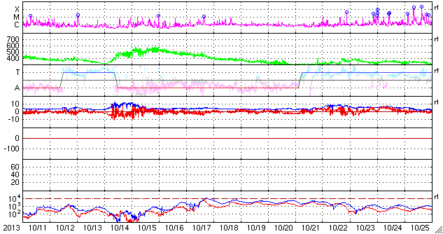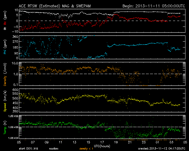 (c) SDO (NASA) ![]() 太陽の東端の活発な活動の様子。下側の活動的な領域は1897黒点群。 (c) SDO (NASA)、 (動画加工 : 宇宙天気ニュース) ![]() SDO衛星のAIA193カメラによる太陽コロナの様子 (c) SDO (NASA) ![]() SDO衛星による太陽の可視光写真。マウスの矢印を写真に重ねると、黒点番号付きの写真に切り替わります。 (c) SDO (NASA) ![]() GOES衛星の太陽X線データ (c) NOAA/SWPC ![]() ACEが観測した太陽風の磁場(1番上の枠、白線は全体の強度、赤線は南北成分) および、太陽風の密度(3番目の橙線)、速度(4番目の黄線) (c) NOAA/SWPC ![]() リアルタイムAE指数 下段のAEグラフの値が高くなると、オーロラ活動が活発化しています。 (c) 京都大学, NICT ![]() 27日の太陽周期に合わせたデータプロット 太陽が同じ面を地球に向けていた27日前の変化から、今後を予想することができます。 (c) 作図:宇宙天気ニュース