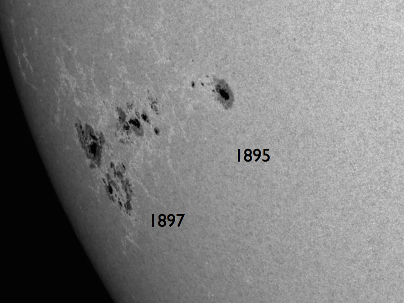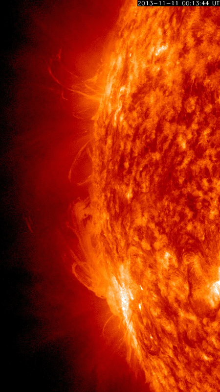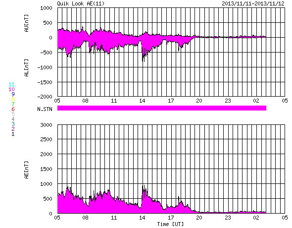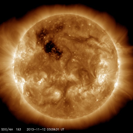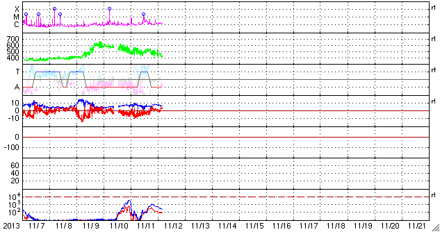 2013/11/12 13:17 更新 東端から1897黒点群が現れています。高速の太陽風は終わりそうです。 担当 篠原 太陽の東端から、 1895黒点群に続いて1897黒点群が大きな姿を現しました。 SDO衛星の可視光カメラによる拡大写真を掲載します。 この黒点群では、昨夜、11日20時(世界時11日11時)に、 M2.4の中規模フレアが発生しています。 この領域を含む太陽の東端の様子を、 SDO衛星AIA304の動画で見て下さい。 ダイナミックな変化があちこちで起きています。 この領域の今後の活動に注目して下さい。 一方、西側に進んだ1890黒点群では、 C4.8、C5.0の小規模フレアが発生していますが、 黒点の見え方としては、次第に小さくなっている様です。 太陽風は、昨日の500km/秒から速度の低下が続き、 そろそろ400km/秒と平均的な速度に戻りそうな様子です。 高速風は2日半くらいで終わりになりそうです。 太陽風の磁場強度は、6〜7nTとやや強まった状態がまだ続いています。 南北成分は南向きから、北寄りに変わり、 それにつれて、磁気圏の活動も活発から穏やかへと変わっています。 AE指数のグラフは、前半は700〜800nTと活発な変化が続いていますが、 後半は小さくなって静かになっています。 SDO衛星AIA193を見ると、太陽の北半球の中緯度域に、 コロナホールが大きく広がっています。 このコロナホールは、27日前にもありましたが、 今回は広がりが増しています。 15〜16日くらいの太陽風に、影響が見られるかもしれません。